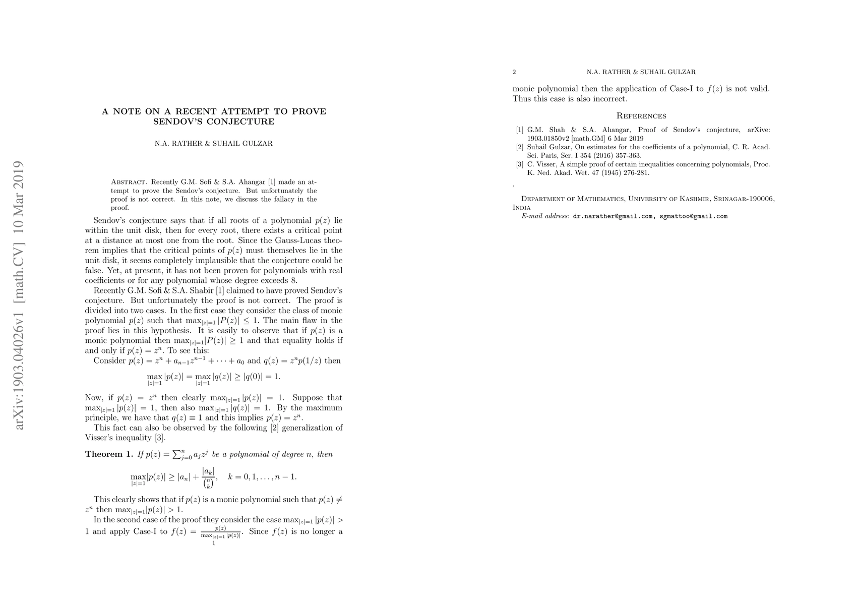 Recently GM Sofi & SA Shabir [arXive: 1903.01850v2 [math.GM] 6 Mar 2019] made an attempt to prove the Sendov's conjecture. But unfortunately the proof is not correct. In this note, we discuss the fallacy in the proof.
