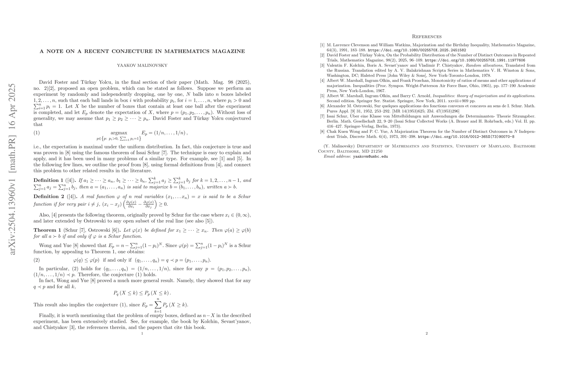 This paper contributes to the understanding of probability distributions in combinatorial experiments, reinforcing the importance of majorization theory and Schur's theorem in resolving related conjectures.