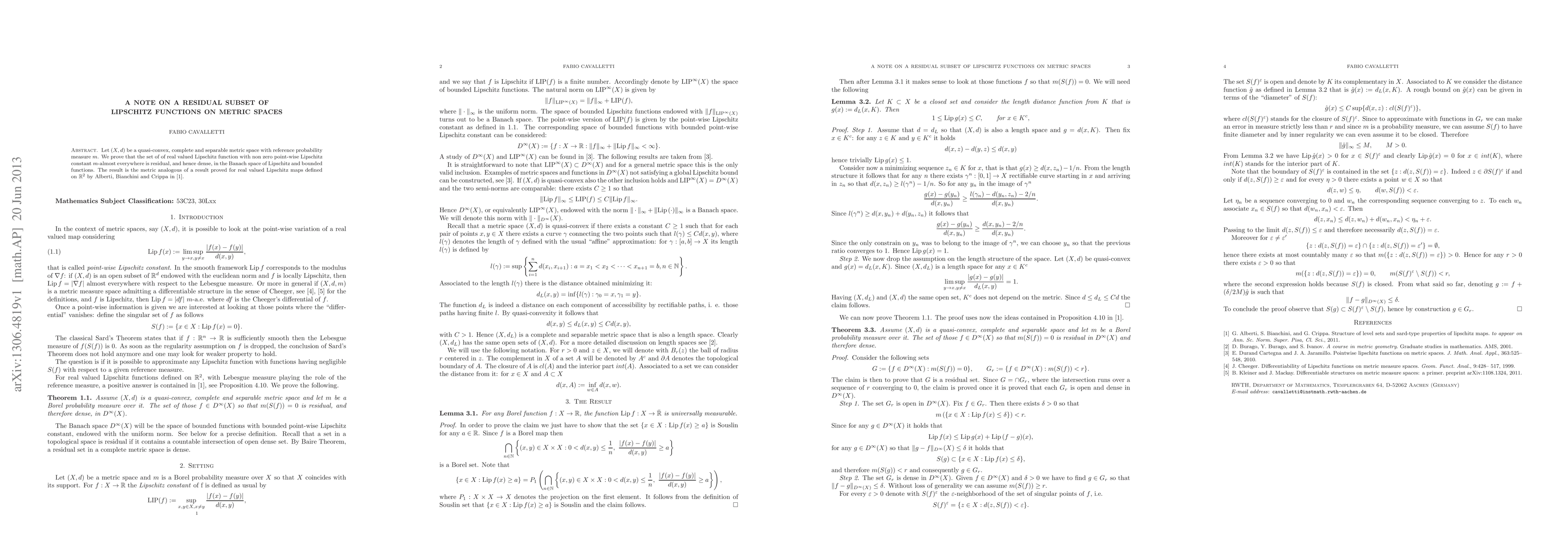 This paper proves that in a quasi-convex, complete, and separable metric space, the set of Lipschitz functions with non-zero point-wise Lipschitz constants is residual and dense in the space of Lipschitz and bounded functions, extending a result previously established by Alberti, Bianchini, and Crippa in the context of R2.
