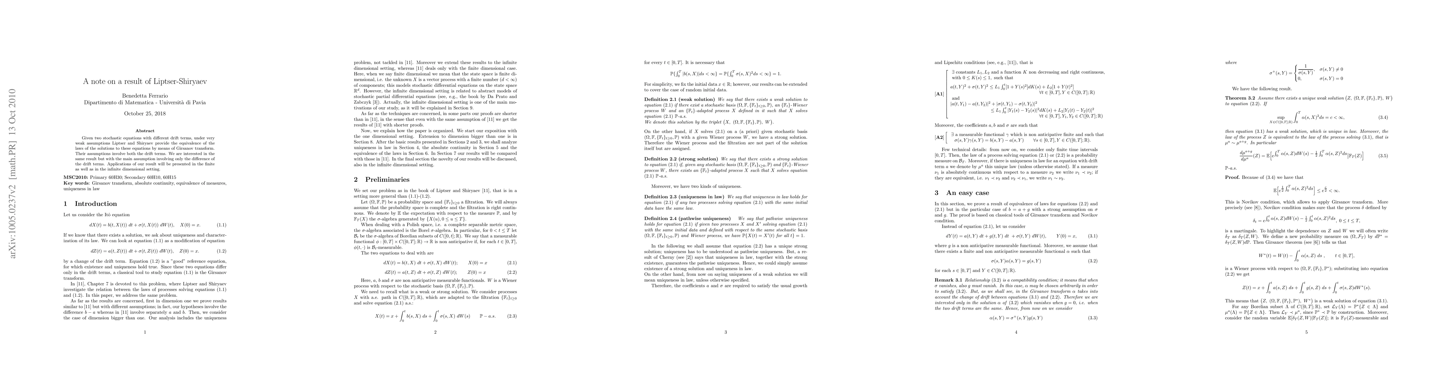 Given two stochastic equations with different drift terms, under very weak assumptions Liptser and Shiryaev provide the equivalence of the laws of the solutions to these equations by means of Girsanov transform. Their assumptions involve both the drift terms. We are interested in the same result but with the main assumption involving only the difference of the drift terms. Applications of our result will be presented in the finite as well as in the infinite dimensional setting.