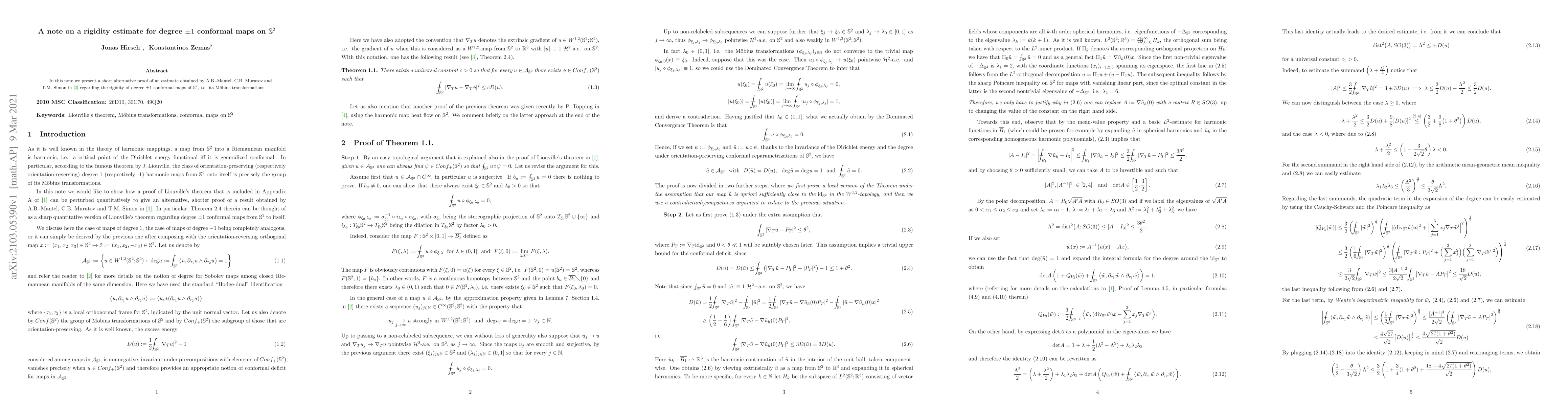 This paper presents a short proof of an estimate for the rigidity of degree $oxed{ extpm 1}$ conformal maps on the surface of a sphere, improving upon previous results.