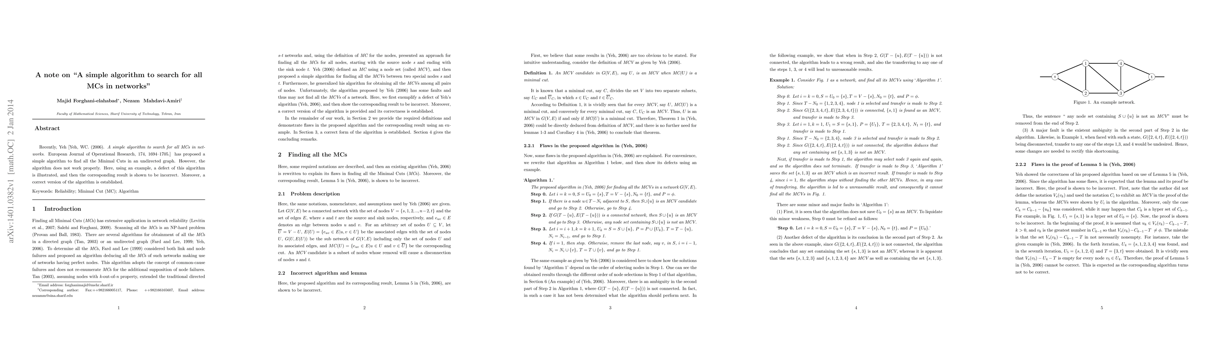 Recently, Yeh [Yeh, WC. (2006). A simple algorithm to search for all MCs in networks. European Journal of Operational Research, 174, 1694{1705.] has proposed a simple algorithm to find all the Minimal Cuts in an undirected graph. However, the algorithm does not work properly. Here, using an example, a defect of this algorithm is illustrated, and then the corresponding result is shown to be incorrect. Moreover, a correct version of the algorithm is established.