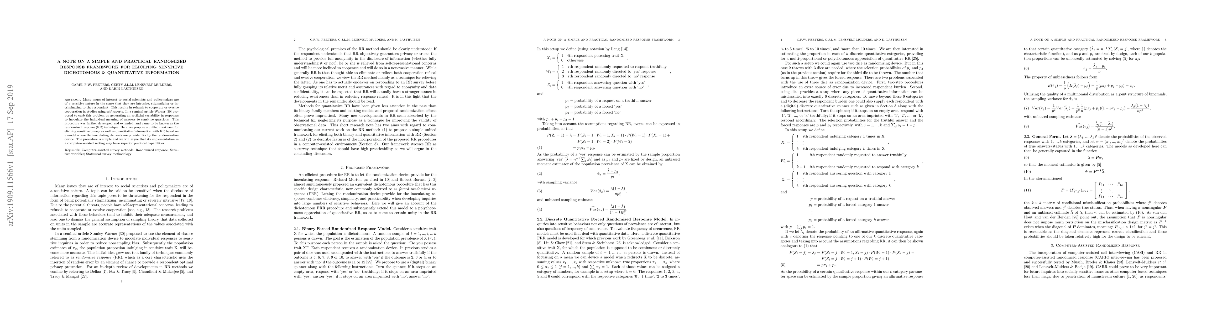 Researchers propose a unified randomized response framework for eliciting sensitive information, offering a simple solution to overcome refusals in self-report studies. The technique combines randomization with computer-assisted methods for practical capabilities.