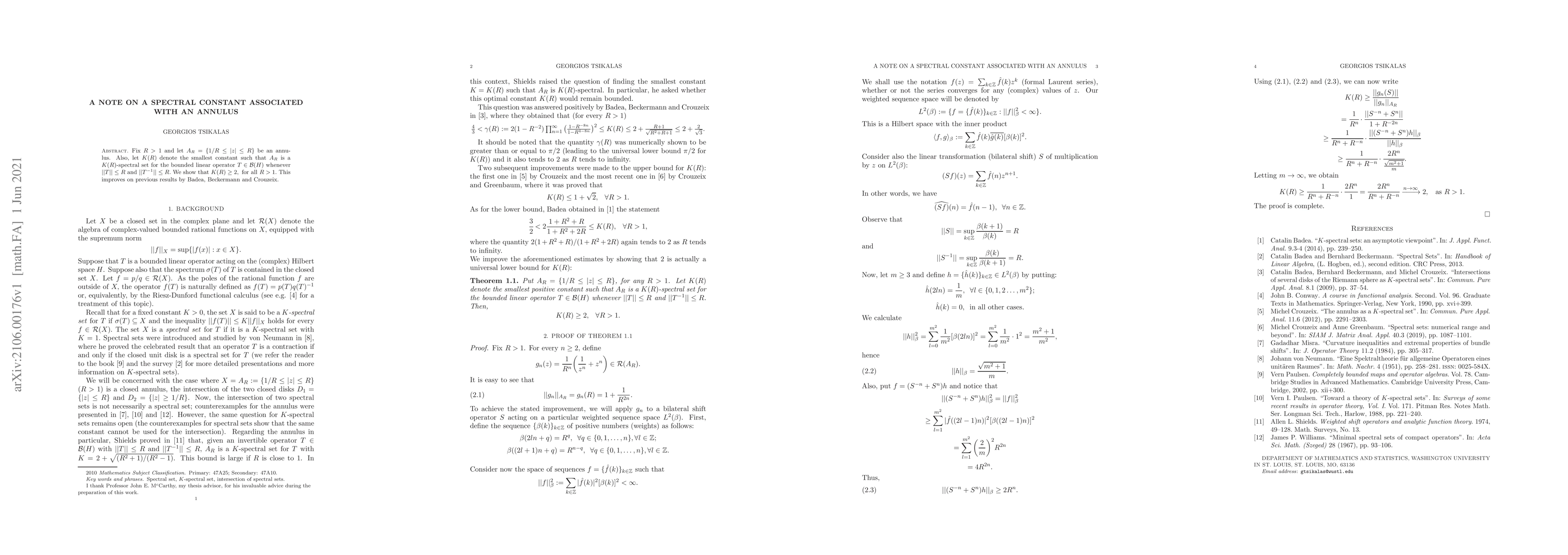 A new study finds that a certain constant associated with an annulus is at least 2 for all R > 1, improving on previous results in the field of operator theory.