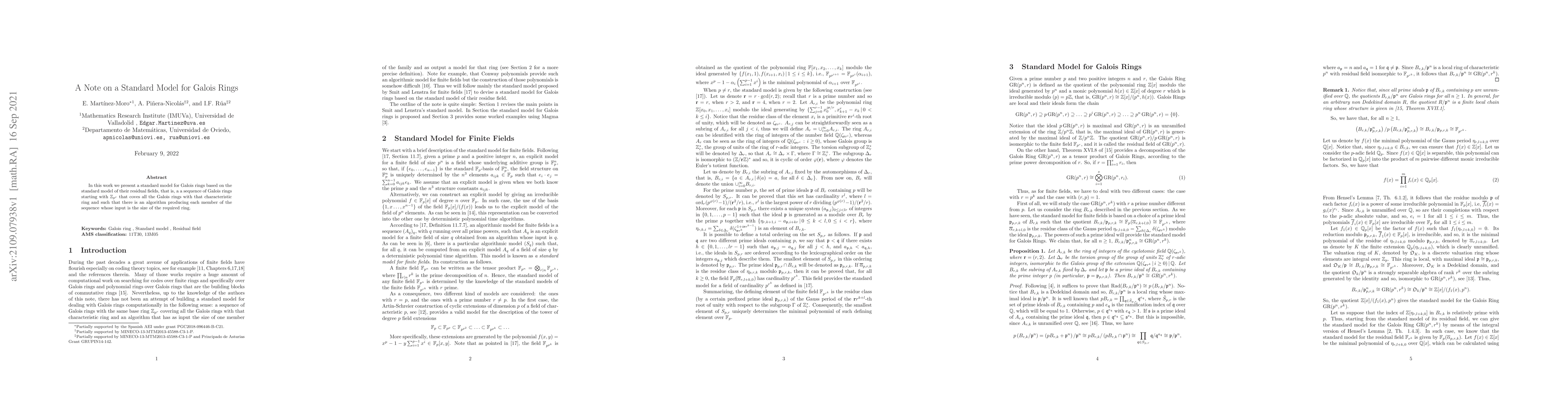 In this work, we present a standard model for Galois rings based on the standard model of their residual fields, that is, a sequence of Galois rings starting with ${\mathbb Z}_{p^r} that coves all the Galois rings with that characteristic ring and such that there is an algorithm producing each member of the sequence whose input is the size of the required ring.