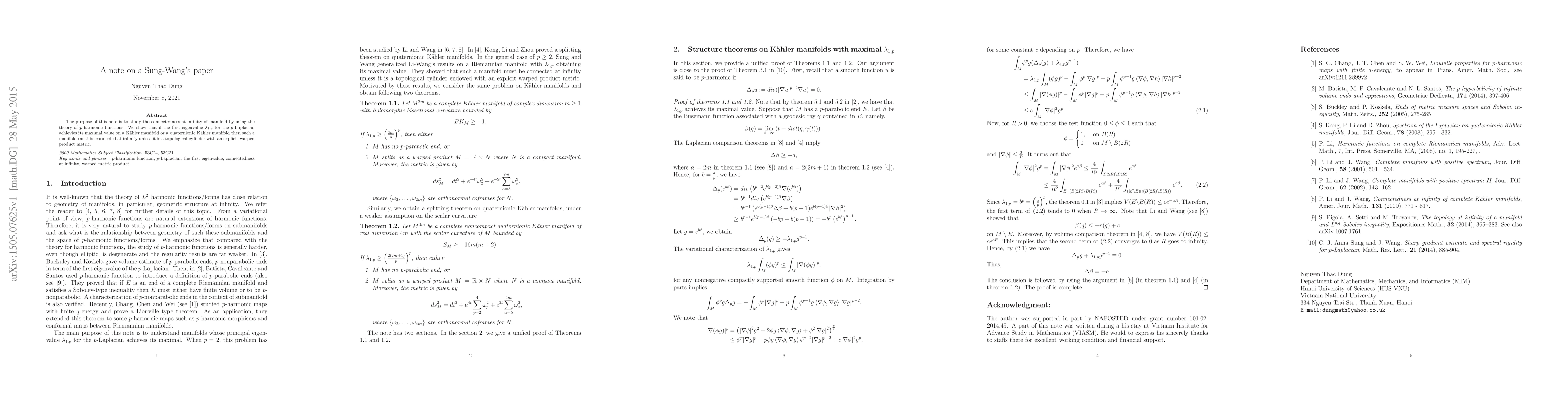 The purpose of this note is to study the connectedness at infinity of manifold by using the theory of $p$-harmonic functions. We show that if the first eigenvalue $\lambda_{1,p}$ for the $p$-Laplacian achievies its maximal value on a K\"{a}hler manifold or a quaternionic K\"{a}hler manifold then such a manifold must be connected at infinity unless it is a topological cylinder with an explicit warped product metric.