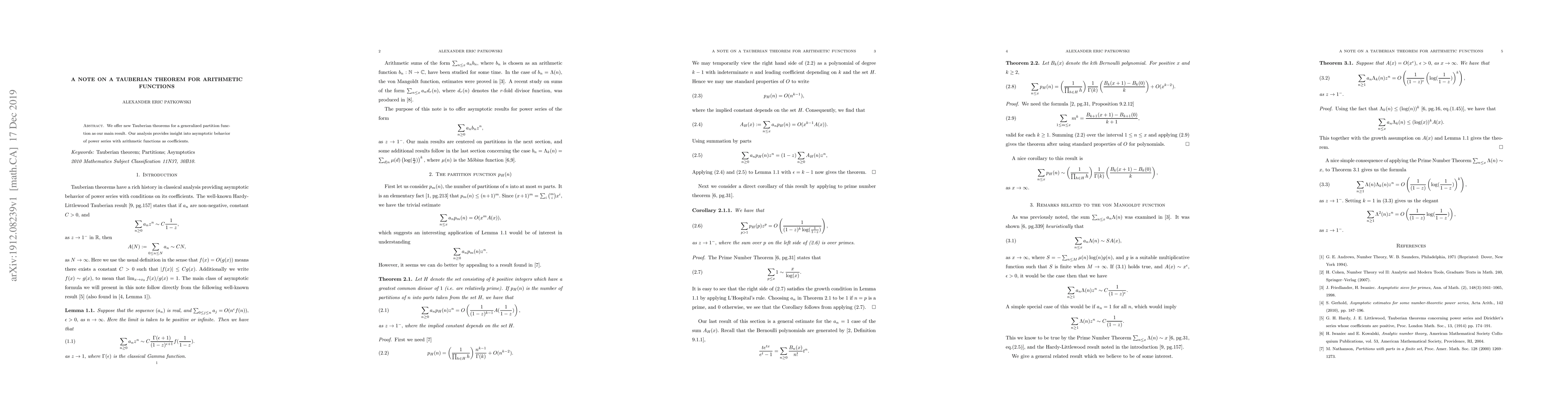 We offer new Tauberian theorems for a generalized partition function as our main result. Our analysis provides insight into asymptotic behavior of power series with arithmetic functions as coefficients.