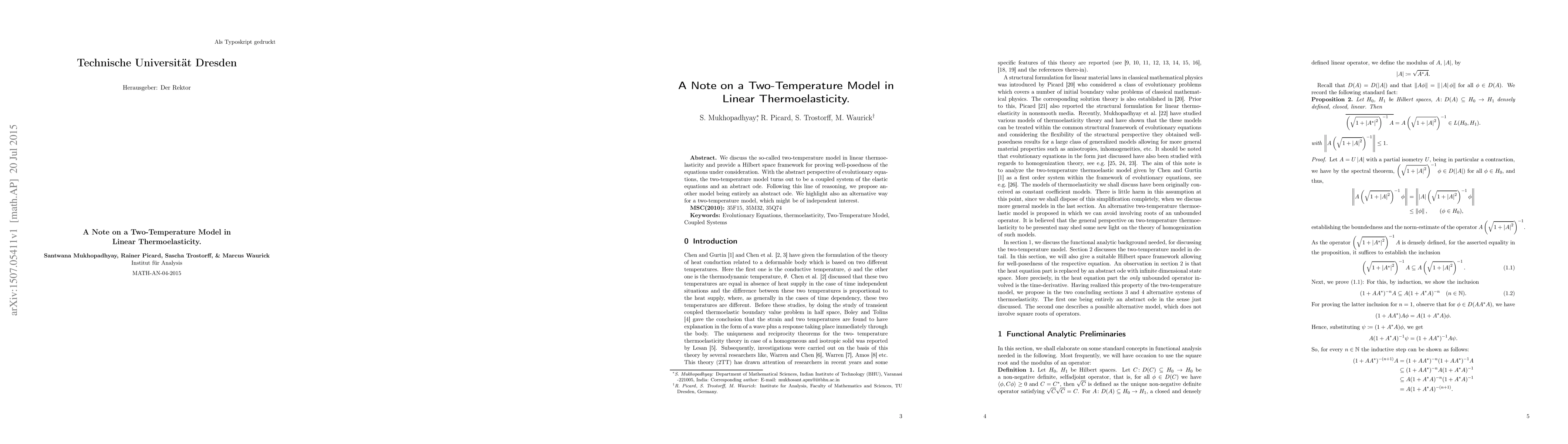 We discuss the so-called two-temperature model in linear thermoelasticity and provide a Hilbert space framework for proving well-posedness of the equations under consideration. With the abstract perspective of evolutionary equations, the two-temperature model turns out to be a coupled system of the elastic equations and an abstract ode. Following this line of reasoning, we propose another model being entirely an abstract ode. We highlight also an alternative way for a two-temperature model, which might be of independent interest.