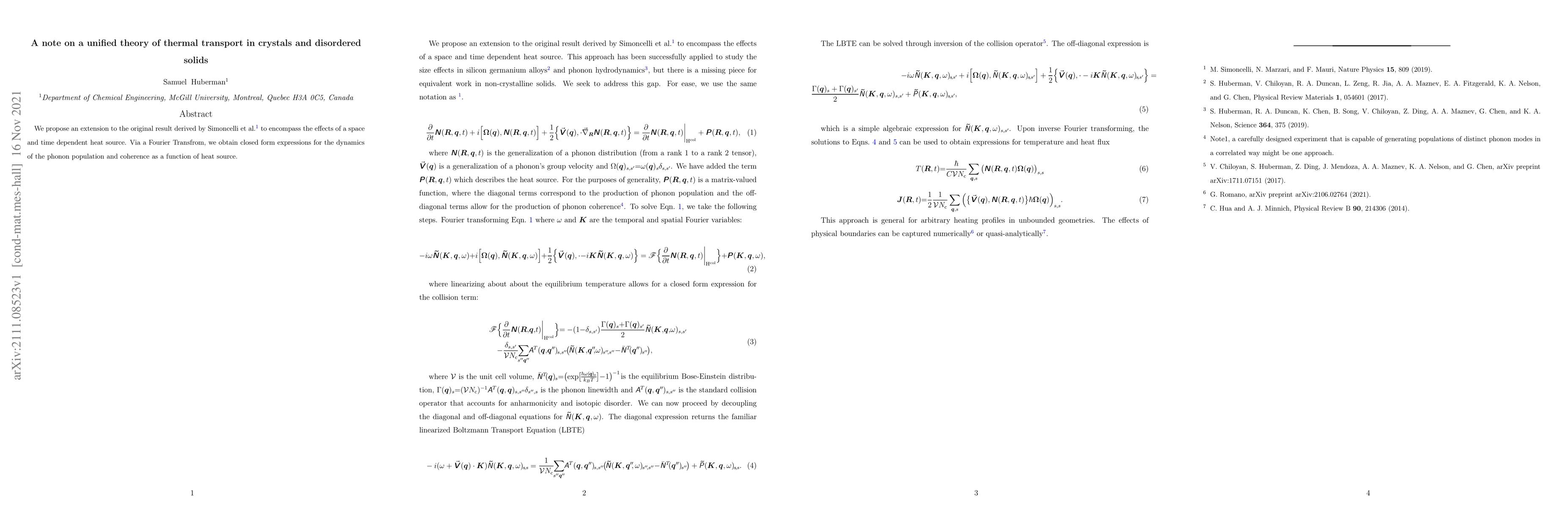 We propose an extension to the original result derived by Simoncelli et al. (https://doi.org/10.1038/s41567-019-0520-x) to encompass the effects of a space and time dependent heat source. Via a Fourier Transfrom, we obtain closed form expressions for the dynamics of the phonon population and coherence as a function of heat source.