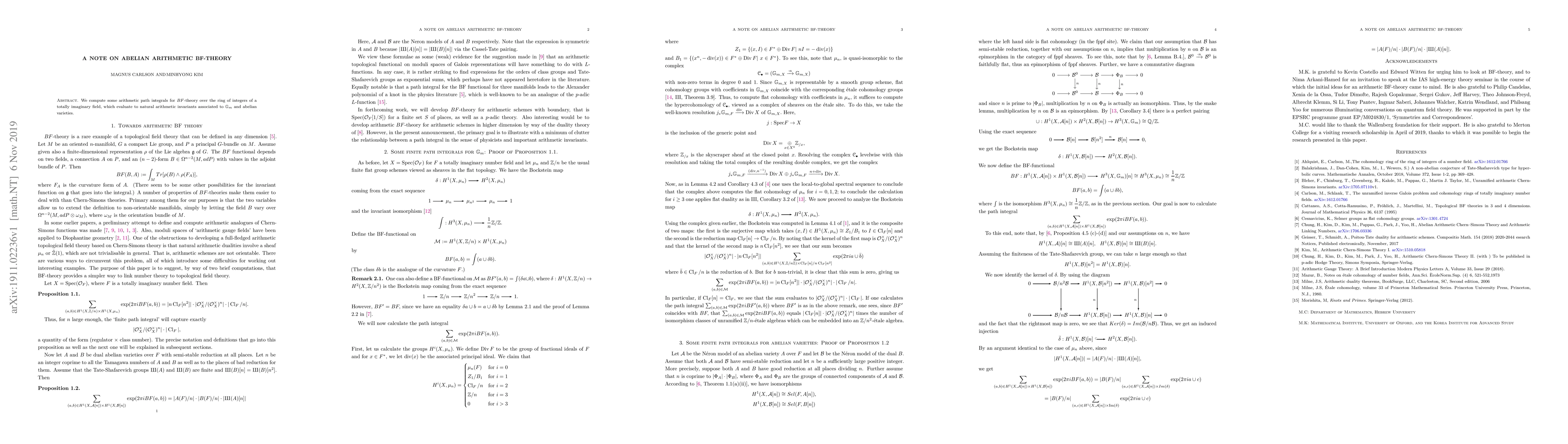 We compute some arithmetic path integrals for BF-theory over the ring of integers of a totally imaginary field, which evaluate to natural arithmetic invariants associated to $\mathbb{G}_m$ and abelian varieties.