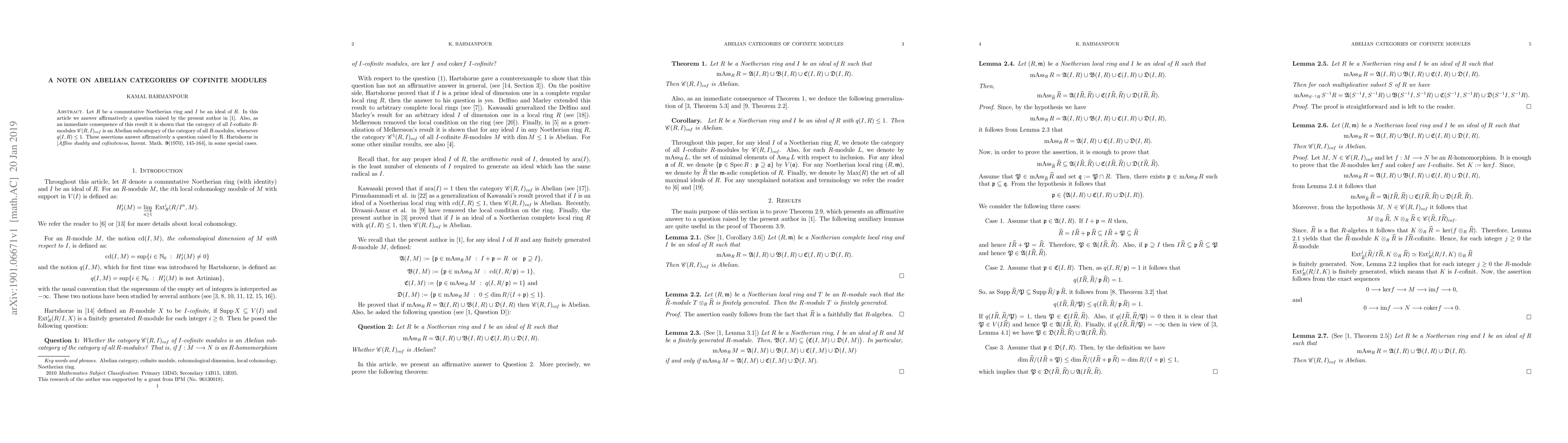 Let $R$ be a commutative Noetherian ring and $I$ be an ideal of $R$. In this article we answer affirmatively a question raised by the present author in \cite{B2}. Also, as an immediate consequence of this result it is shown that the category of all $I$-cofinite $R$-modules $\mathscr{C}(R, I)_{cof}$ is an Abelian subcategory of the category of all $R$-modules, whenever $q(I,R)\leq 1$. These assertions answer affirmatively a question raised by R. Hartshorne in [{\it Affine duality and cofiniteness}, Invent. Math. {\bf9}(1970), 145-164], in some special cases.