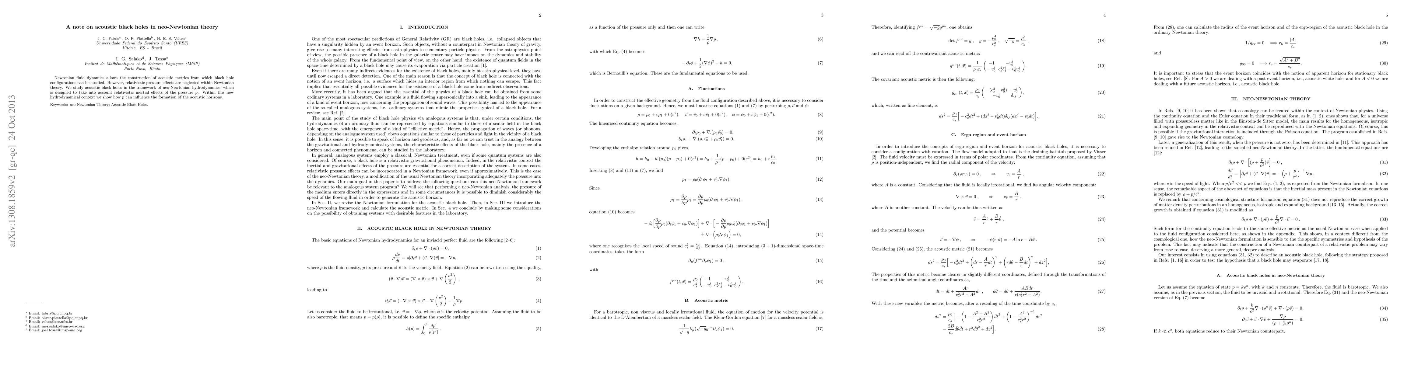 This paper explores acoustic black holes within neo-Newtonian hydrodynamics, addressing relativistic inertial effects of pressure that are neglected in traditional Newtonian fluid dynamics. It demonstrates how pressure influences the formation of acoustic horizons in this new theoretical framework.