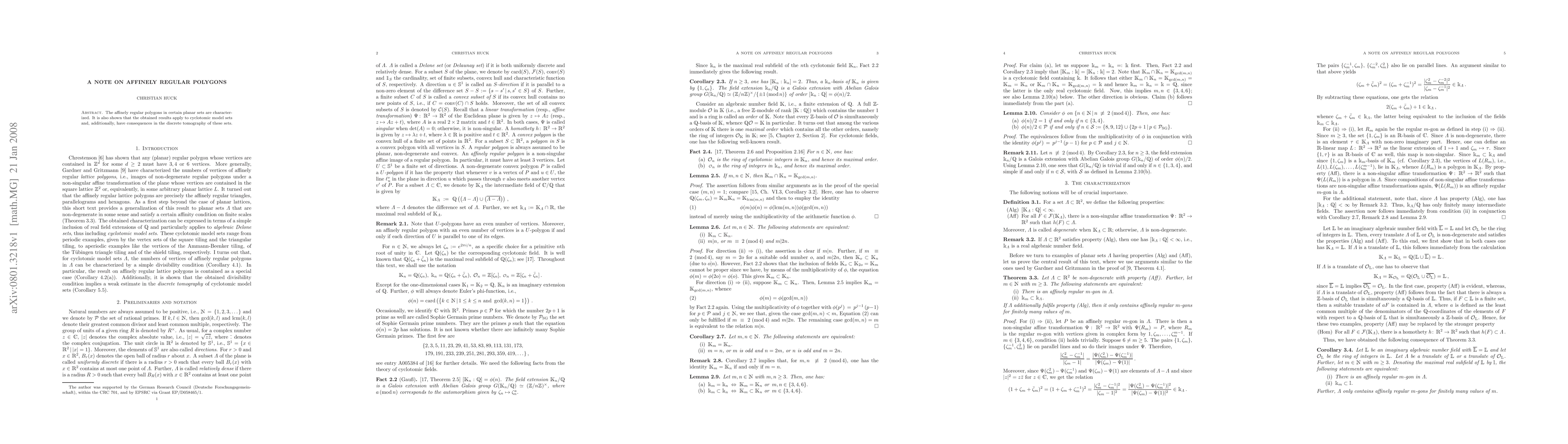 Summary: This paper explores the characteristics of affinely regular polygons within specific planar sets, demonstrating their relevance to cyclotomic model sets and implications for discrete tomography in these contexts.