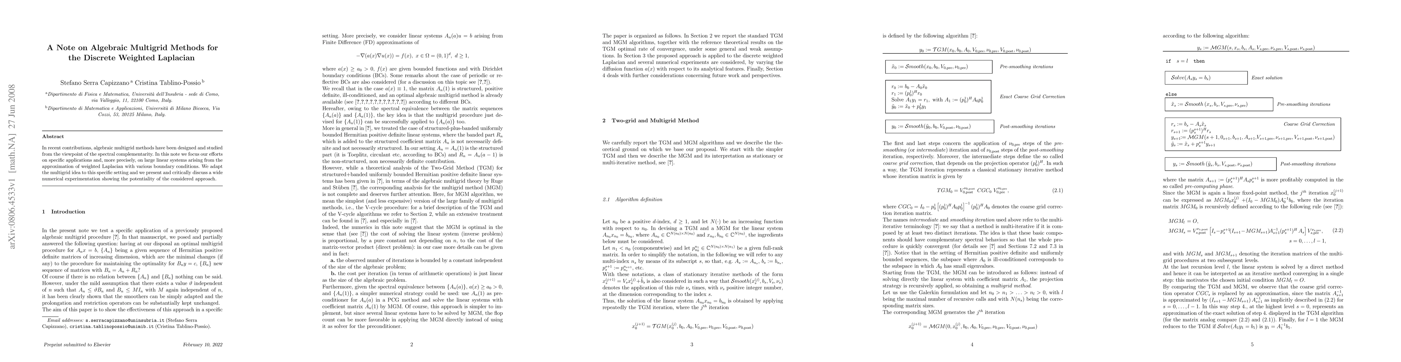 This paper explores algebraic multigrid methods tailored for large linear systems derived from the approximation of the weighted Laplacian with various boundary conditions. The authors adapt the multigrid approach and present extensive numerical experiments demonstrating the effectiveness of the proposed method.