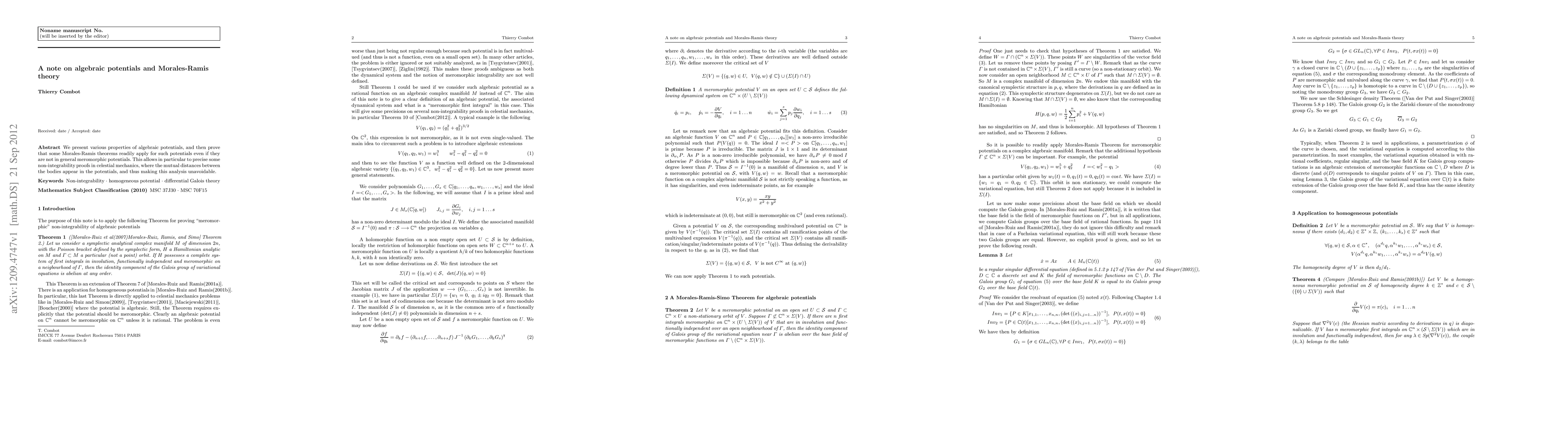This paper explores the properties of algebraic potentials and demonstrates that Morales-Ramis theorems can be applied to them, even when they are not meromorphic. This extension facilitates more precise non-integrability proofs in celestial mechanics involving mutual distances between celestial bodies.