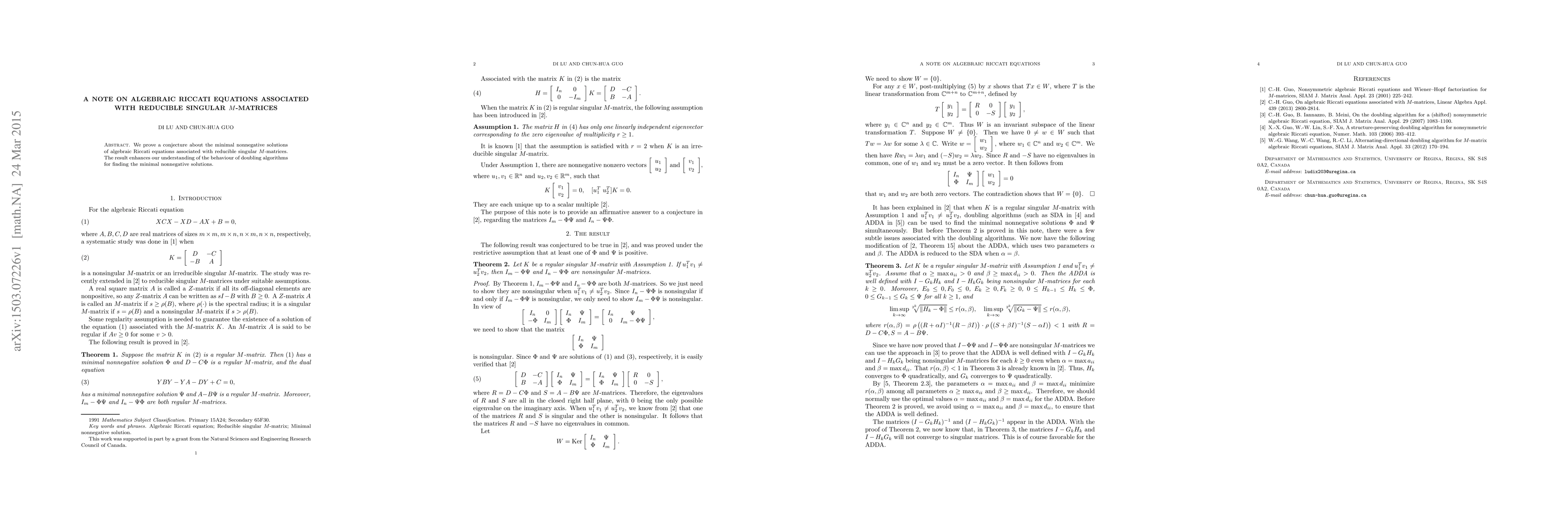 Summary: This paper proves a conjecture regarding the minimal nonnegative solutions of algebraic Riccati equations linked to reducible singular M-matrices, thereby improving comprehension of the behavior of doubling algorithms used to find these solutions.