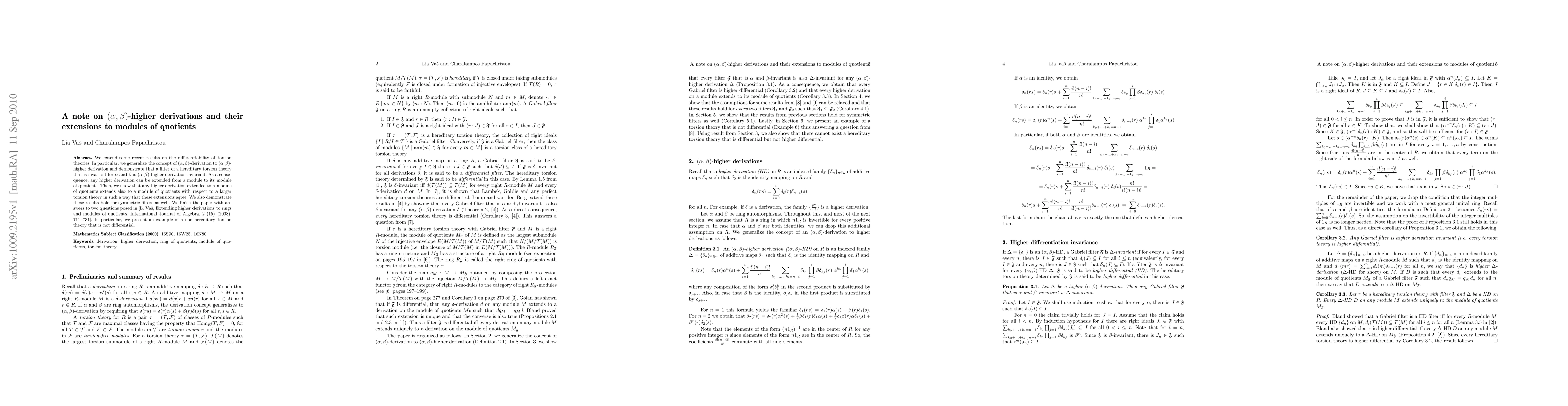 We extend some recent results on the differentiability of torsion theories. In particular, we generalize the concept of $(\alpha, \beta)$-derivation to $(\alpha, \beta)$-higher derivation and demonstrate that a filter of a hereditary torsion theory that is invariant for $\alpha$ and $\beta$ is $(\alpha, \beta)$-higher derivation invariant. As a consequence, any higher derivation can be extended from a module to its module of quotients. Then, we show that any higher derivation extended to a module of quotients extends also to a module of quotients with respect to a larger torsion theory in such a way that these extensions agree. We also demonstrate these results hold for symmetric filters as well. We finish the paper with answers to two questions posed in [L. Va\s, Extending higher derivations to rings and modules of quotients, International Journal of Algebra, 2 (15) (2008), 711--731]. In particular, we present an example of a non-hereditary torsion theory that is not differential.