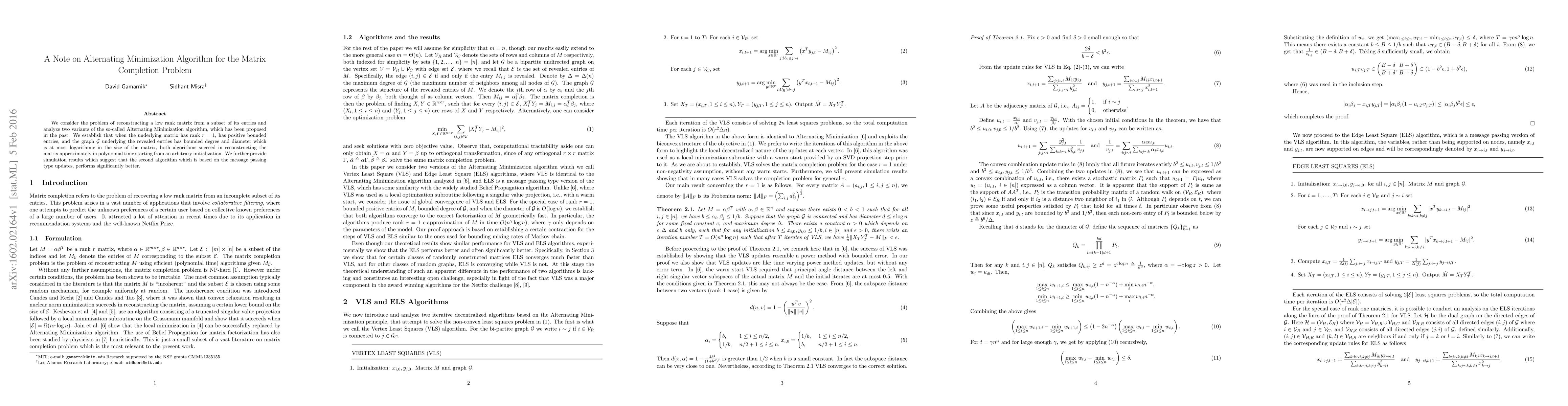 We consider the problem of reconstructing a low rank matrix from a subset of its entries and analyze two variants of the so-called Alternating Minimization algorithm, which has been proposed in the past. We establish that when the underlying matrix has rank $r=1$, has positive bounded entries, and the graph $\mathcal{G}$ underlying the revealed entries has bounded degree and diameter which is at most logarithmic in the size of the matrix, both algorithms succeed in reconstructing the matrix approximately in polynomial time starting from an arbitrary initialization. We further provide simulation results which suggest that the second algorithm which is based on the message passing type updates, performs significantly better.