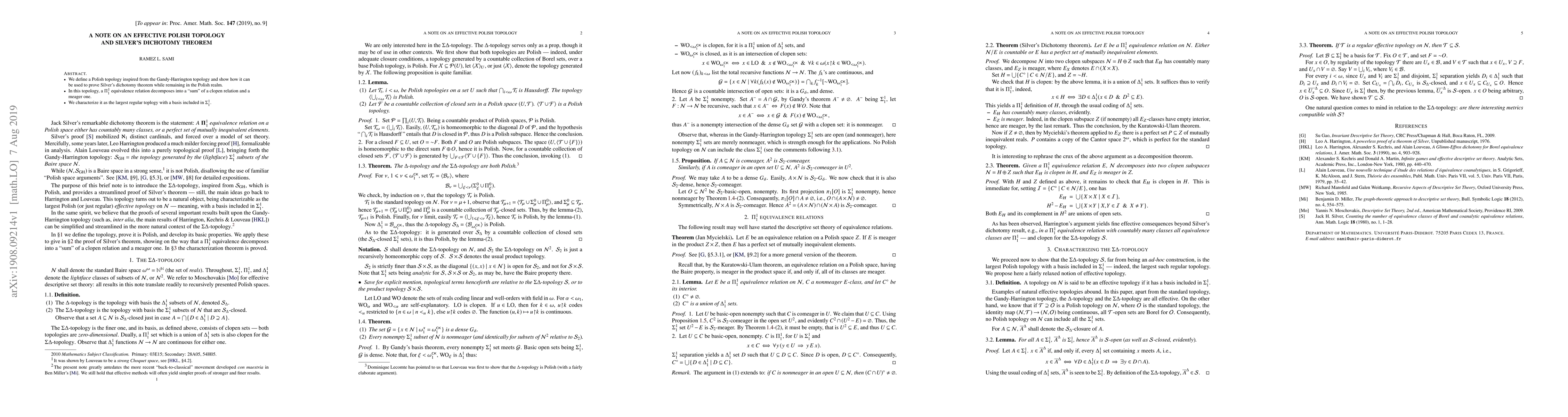 We define a Polish topology inspired from the Gandy-Harrington topology and show how it can be used to prove Silver's dichotomy theorem while remaining in the Polish realm. In this topology, a $\Pi^1_1$ equivalence relation decomposes into a "sum" of a clopen relation and a meager one. We characterize it as the largest regular toplogy with a basis included in $\Sigma^1_1$.
