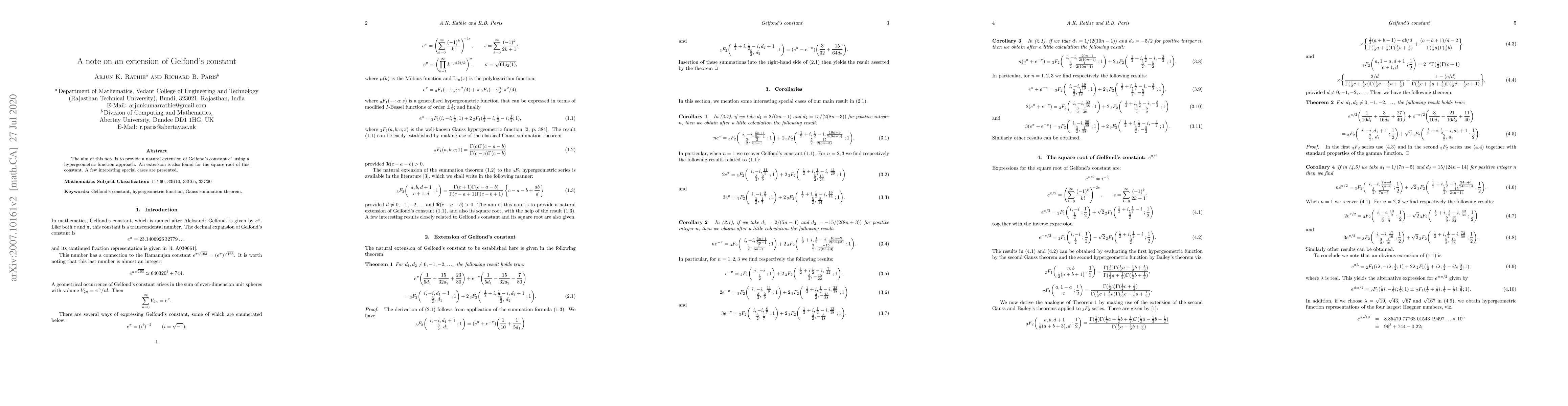 This paper extends Gelfond's constant $e^\pi$ through a hypergeometric function approach, also finding an extension for its square root, and highlights some intriguing special cases.