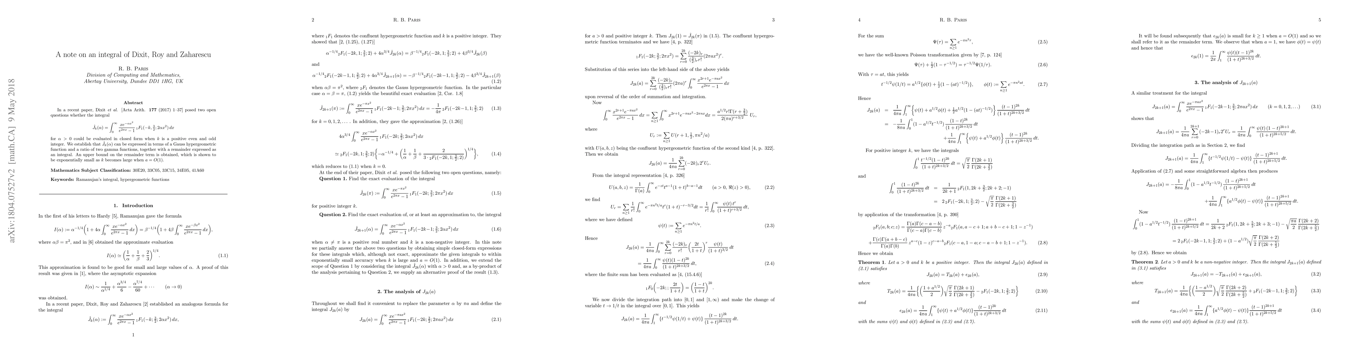 In a recent paper, Dixit {\it et al.\/} [Acta Arith. {\bf 177} (2017) 1--37] posed two open questions whether the integral \[{\hat J}_{k}(\alpha)=\int_0^\infty\frac{xe^{-\alpha x^2}}{e^{2\pi x}-1}\,{}_1F_1(-k,3/2;2\alpha x^2)\,dx\] for $\alpha>0$ could be evaluated in closed form when $k$ is a positive even and odd integer. We establish that ${\hat J}_{k}(\alpha)$ can be expressed in terms of a Gauss hypergeometric function and a ratio of two gamma functions, together with a remainder expressed as an integral. An upper bound on the remainder term is obtained, which is shown to be exponentially small as $k$ becomes large when $a=O(1)$.