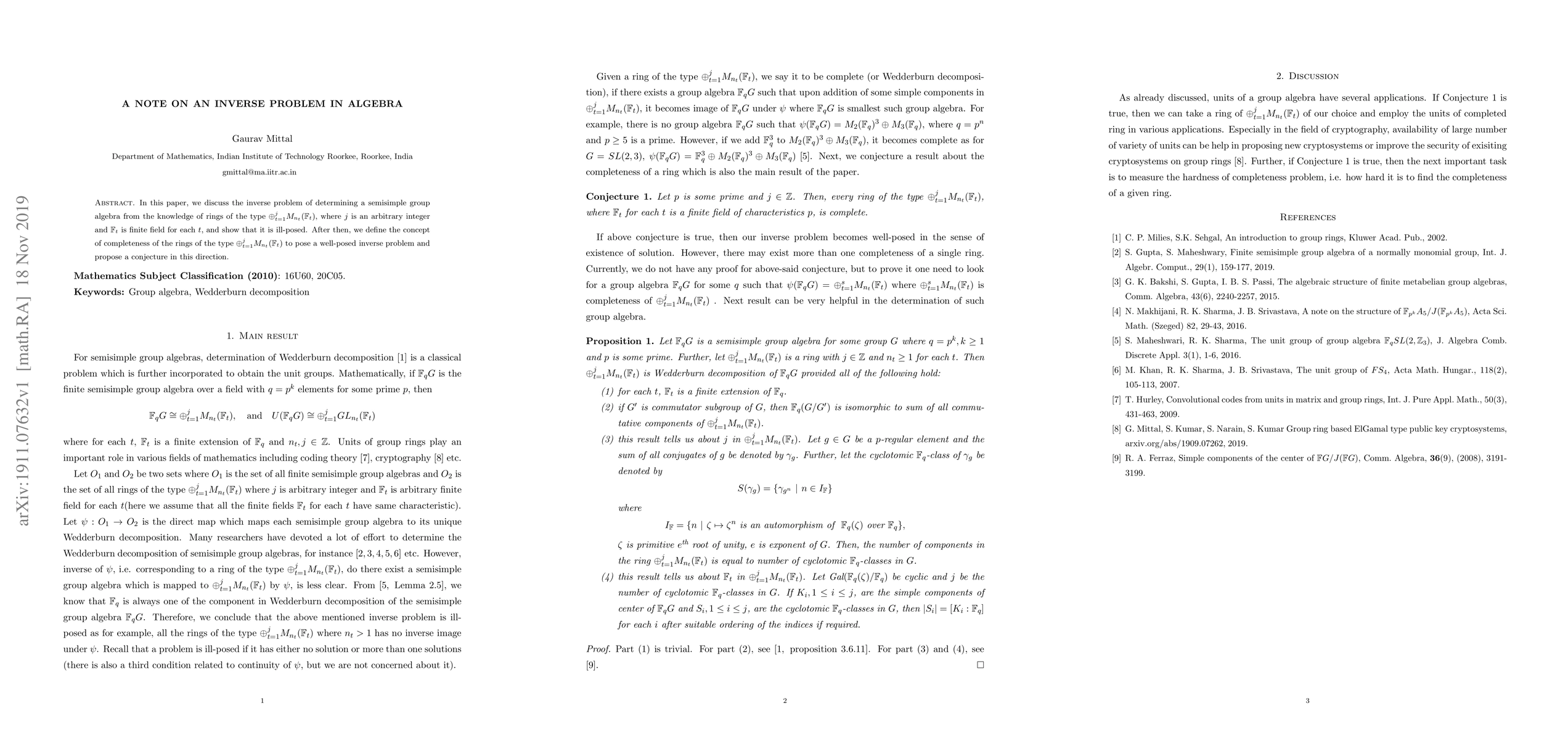 The research discusses the inverse problem of determining a semisimple group algebra from the knowledge of rings of the type sum_{t=1}^s M_{n_t}(Ft) and proposes a conjecture about the completeness of such rings.
