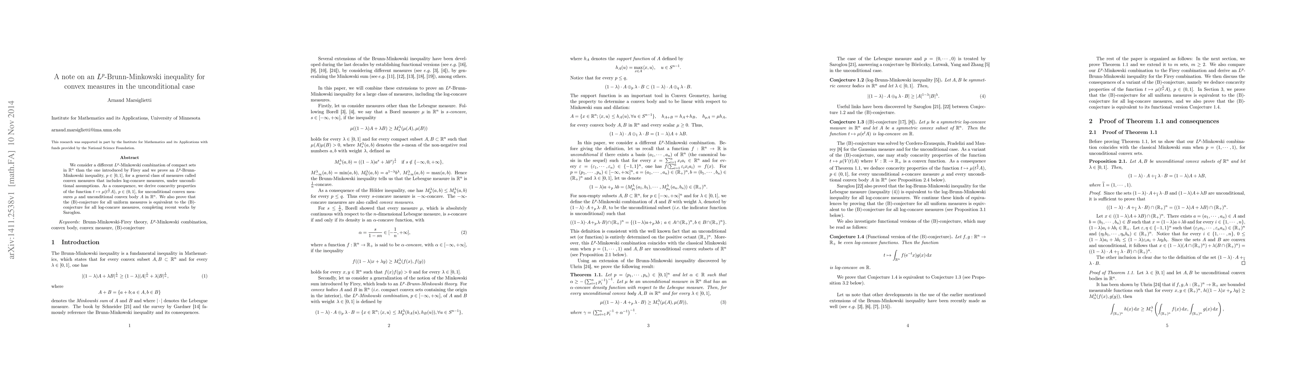 Researchers prove an $L^p$-Brunn-Minkowski inequality for convex measures in $ ext{R}^n$, with implications for concavity properties of certain functions and the (B)-conjecture for log-concave measures.
