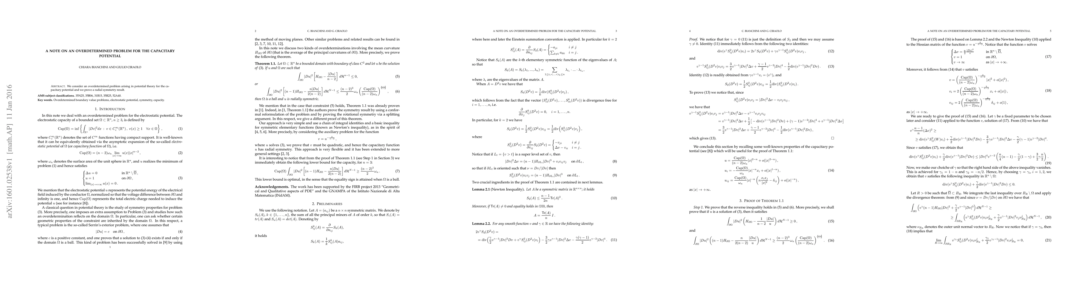 This research proves a radial symmetry result for an overdetermined problem concerning the capacitary potential in potential theory, providing insights into the behavior of such potentials under specific conditions.