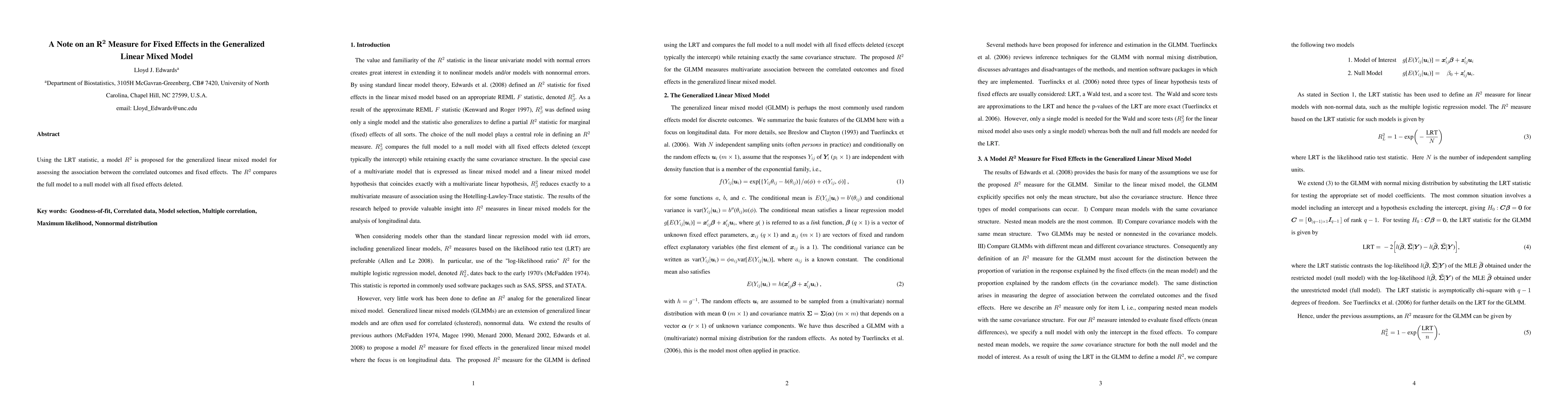 Summary: This paper proposes an R^2 measure for the generalized linear mixed model using the likelihood ratio test (LRT) statistic to assess the association between correlated outcomes and fixed effects by comparing a full model to a null model without fixed effects.