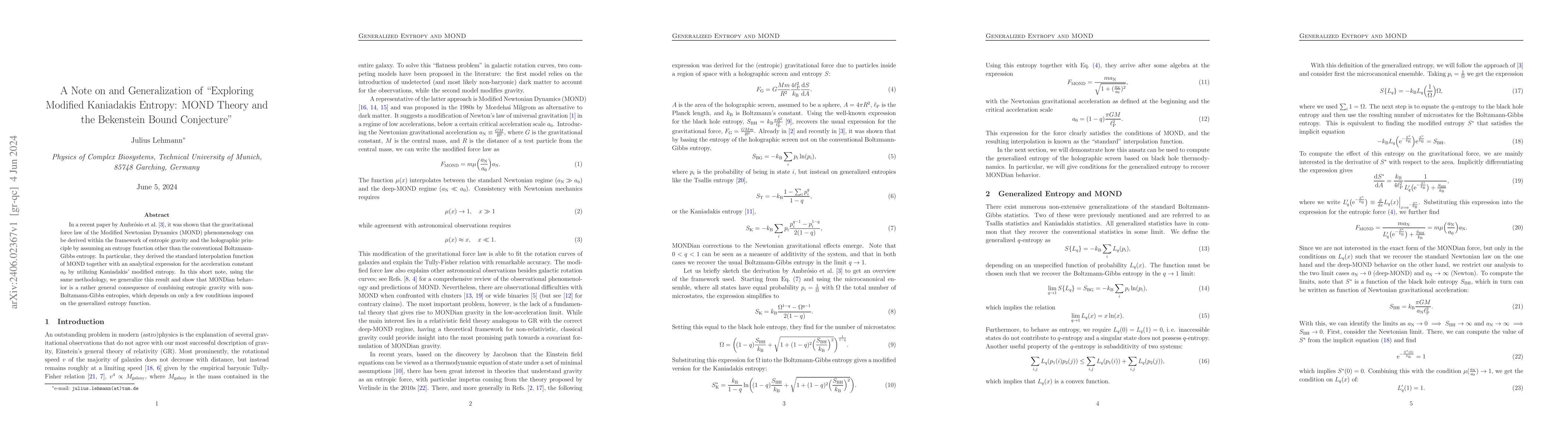In a recent paper by Ambr\'osio et al. [arXiv:2405.14799], it was shown that the gravitational force law of the Modified Newtonian Dynamics (MOND) phenomenology can be derived within the framework of entropic gravity and the holographic principle by assuming an entropy function other than the conventional Boltzmann-Gibbs entropy. In particular, they derived the standard interpolation function of MOND together with an analytical expression for the acceleration constant $a_0$ by utilizing Kaniadakis' modified entropy. In this short note, using the same methodology, we generalize this result and show that MONDian behavior is a rather general consequence of combining entropic gravity with non-Boltzmann-Gibbs entropies, which depends on only a few conditions imposed on the generalized entropy function.