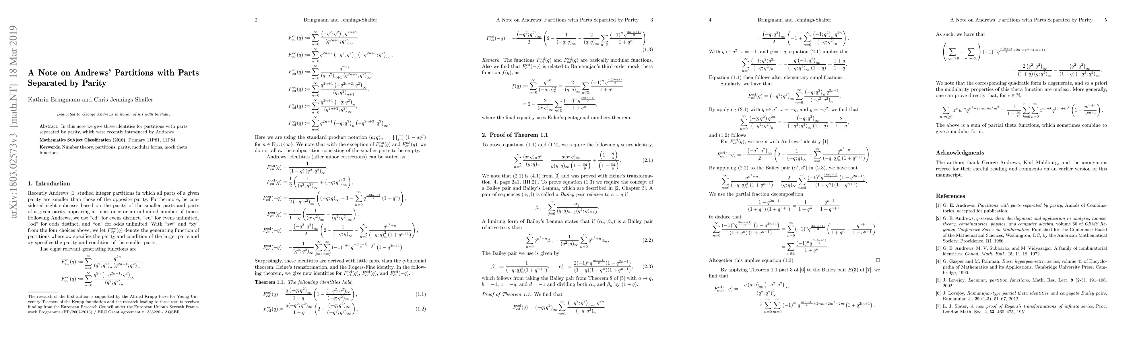 Summary: This paper presents three new identities concerning partitions where parts are divided by parity, an idea initially developed by Andrews, expanding on his foundational work.
