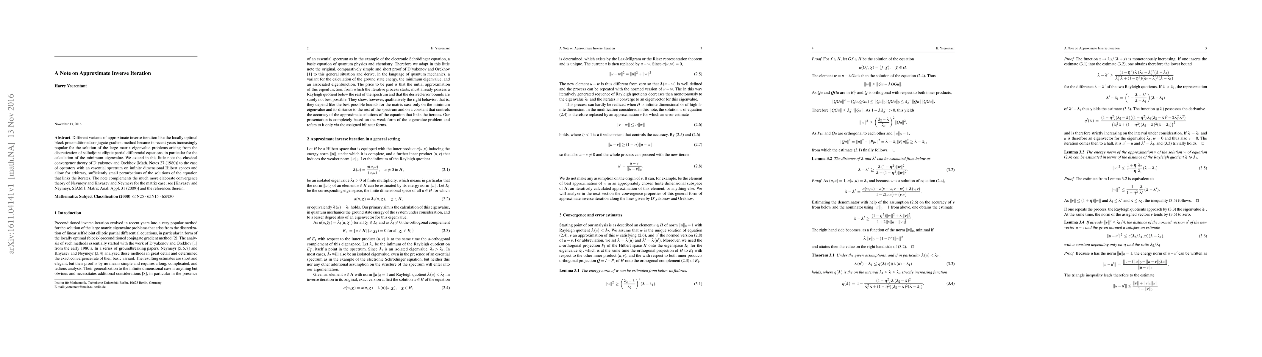 Different variants of approximate inverse iteration like the locally optimal block preconditioned conjugate gradient method became in recent years increasingly popular for the solution of the large matrix eigenvalue problems arising from the discretization of selfadjoint elliptic partial differential equations, in particular for the calculation of the minimum eigenvalue. We extend in this little note the classical convergence theory of D'yakonov and Orekhov [Math. Notes 27 (1980)] to the case of operators with an essential spectrum on infinite dimensional Hilbert spaces and allow for arbitrary, sufficiently small perturbations of the solutions of the equation that links the iterates. The note complements the much more elaborate convergence theory of Neymeyr and Knyazev and Neymeyr for the matrix case (see [Knyazev and Neymeyr, SIAM J. Matrix Anal. Appl. 31 (2009)] and the references therein) and is suitable for classroom presentation.