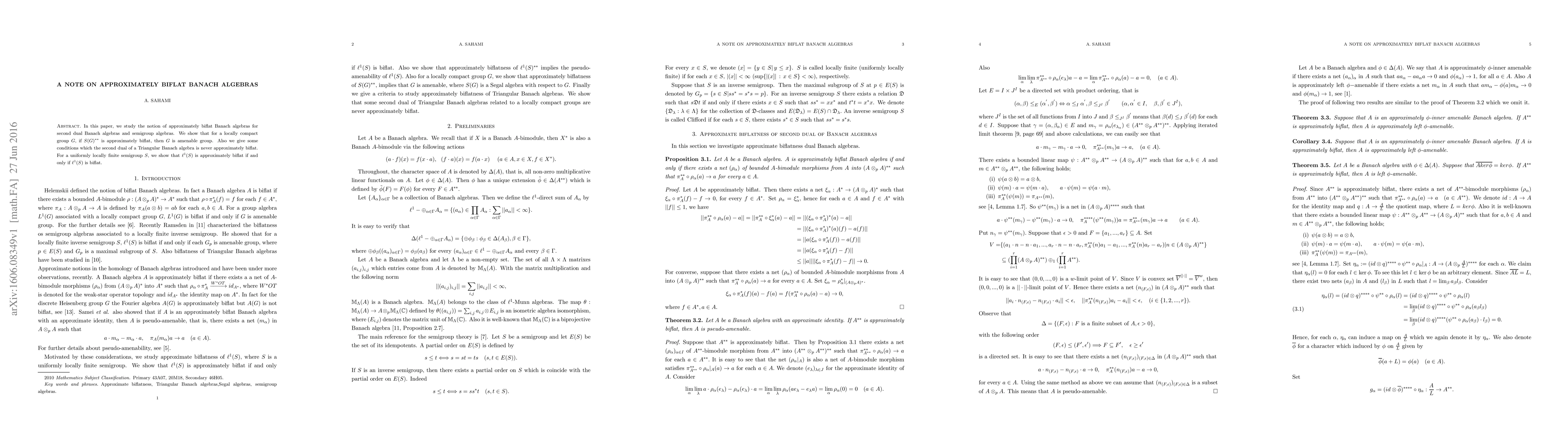 In this paper, we study the notion of approximately bi at Banach algebras for second dual Banach algebras and semigroup algebras. We show that for a locally compact group G, if S(G)?? is approximately bi at, then G is amenable group. Also we give some conditions which the second dual of a Triangular Banach algebra is never approximately bi at. For a uniformly locally finite semigroup S, we show that `1(S) is approximately bi at if and only if `1(S) is bi at.