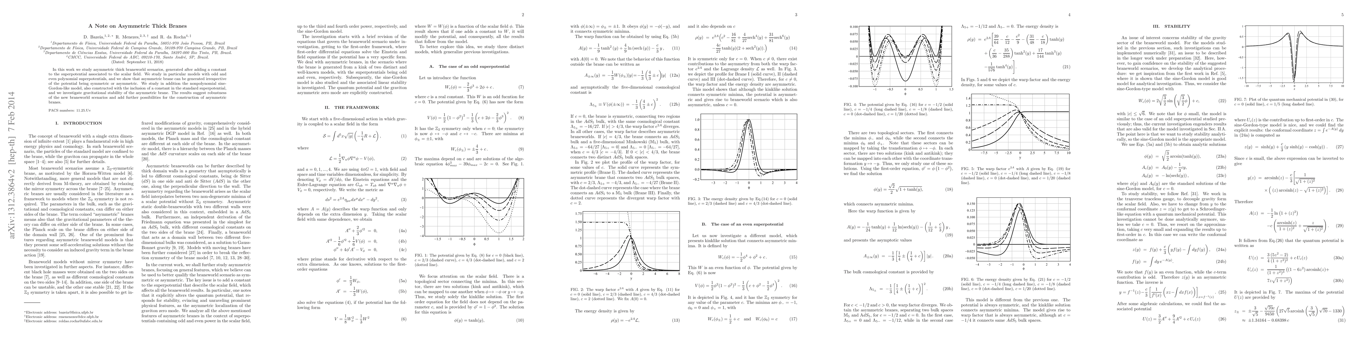 In this work we study asymmetric thick braneworld scenarios, generated after adding a constant to the superpotential associated to the scalar field. We study in particular models with odd and even polynomial superpotentials, and we show that asymmetric brane can be generated irrespective of the potential being symmetric or asymmetric. We study in addition the nonpolynomial sine-Gordon-like model, also constructed with the inclusion of a constant in the standard superpotential, and we investigate gravitational stability of the asymmetric brane. The results suggest robustness of the new braneworld scenarios and add further possibilities for the construction of asymmetric branes.
