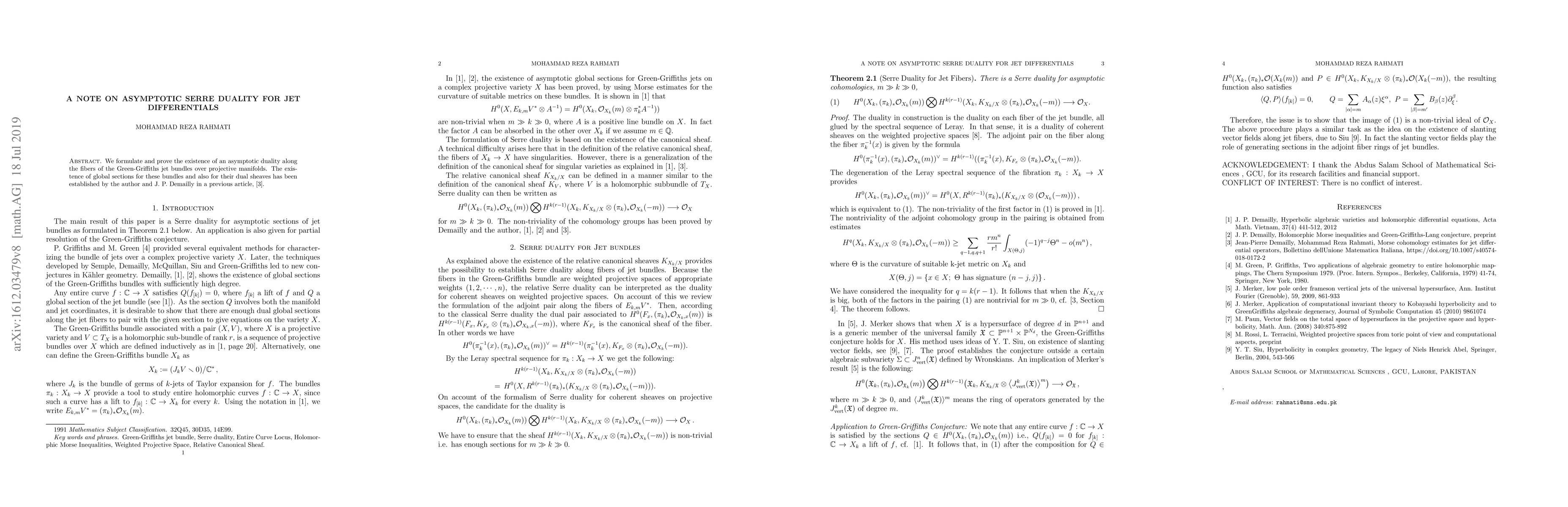 This paper establishes asymptotic Serre duality for jet differentials on projective manifolds, proving the existence of duality along the fibers of the Green-Griffiths jet bundles. The authors build on prior work establishing global sections for these bundles and their dual sheaves.