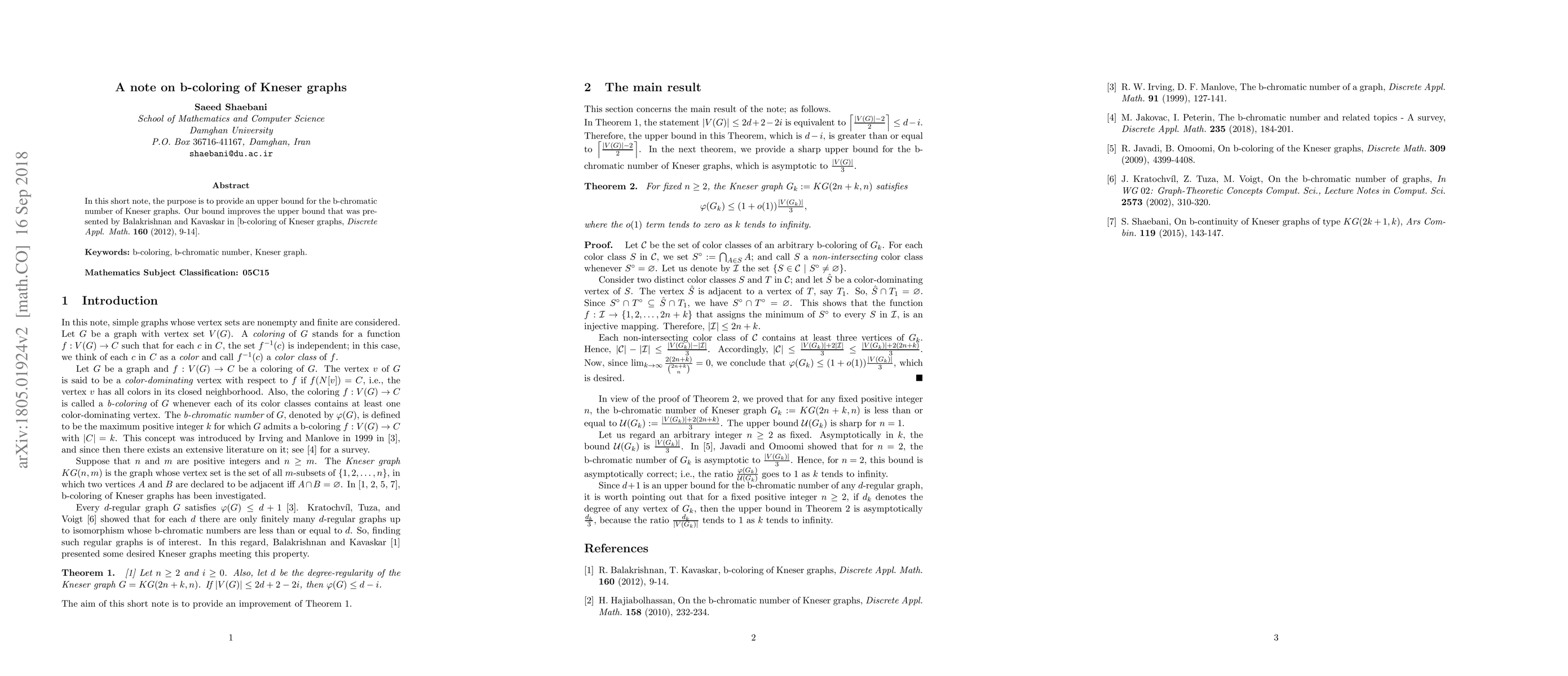 In this short note, the purpose is to provide an upper bound for the b-chromatic number of Kneser graphs. Our bound improves the upper bound that was presented by Balakrishnan and Kavaskar in [b-coloring of Kneser graphs, Discrete Appl. Math. 160 (2012), 9-14].