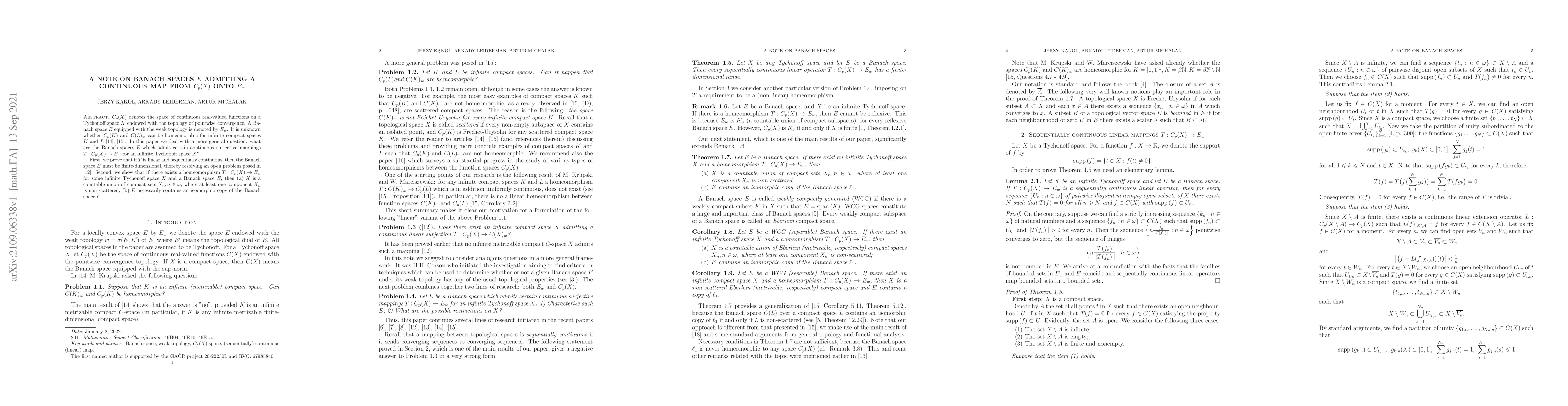 This paper investigates Banach spaces $E$ that can be mapped continuously onto $E_{w}$ from $C_p(X)$, where $C_p(X)$ is the space of continuous functions on a Tychonoff space $X$. The study resolves an open problem by proving that linear and sequentially continuous mappings imply $E$ is finite-dimensional. It also shows that if such a mapping exists for an infinite Tychonoff space, $E$ must contain $\ell_{1}$ and $X$ must be a countable union of compact sets with at least one non-scattered component.