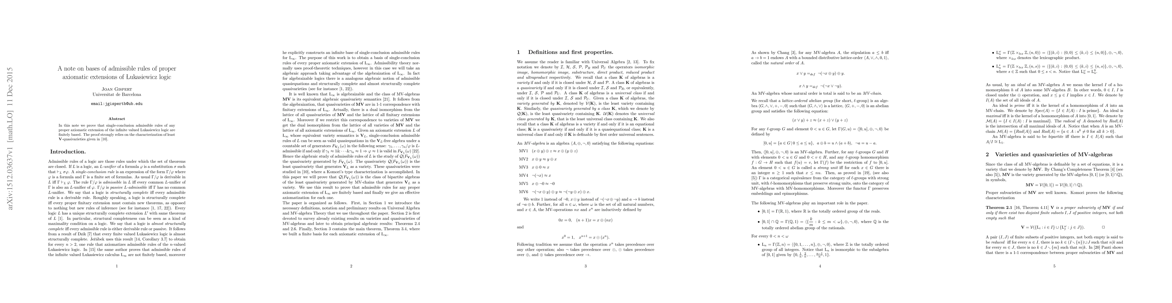 Summary: This paper demonstrates that single-conclusion admissible rules in any proper axiomatic extension of infinite-valued Lukasiewicz logic are finitely based, providing a foundational result for the structure of these logical systems.