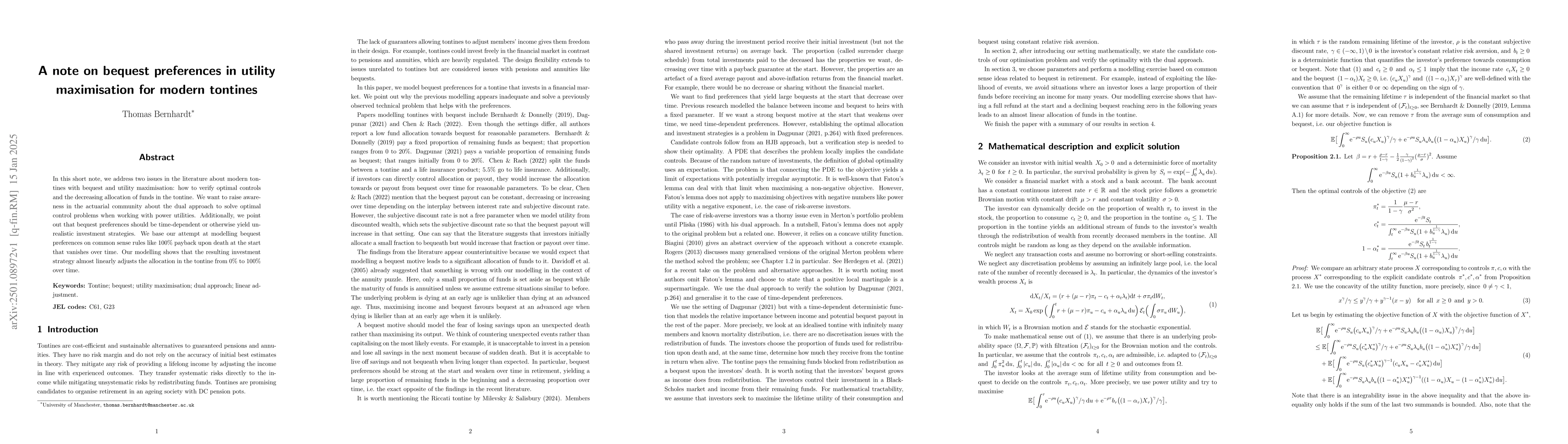 In this short note, we address two issues in the literature about modern tontines with bequest and utility maximisation: how to verify optimal controls and the decreasing allocation of funds in the tontine. We want to raise awareness in the actuarial community about the dual approach to solve optimal control problems when working with power utilities. Additionally, we point out that bequest preferences should be time-dependent or otherwise yield unrealistic investment strategies. We base our attempt at modelling bequest preferences on common sense rules like 100% payback upon death at the start that vanishes over time. Our modelling shows that the resulting investment strategy almost linearly adjusts the allocation in the tontine from 0% to 100% over time.