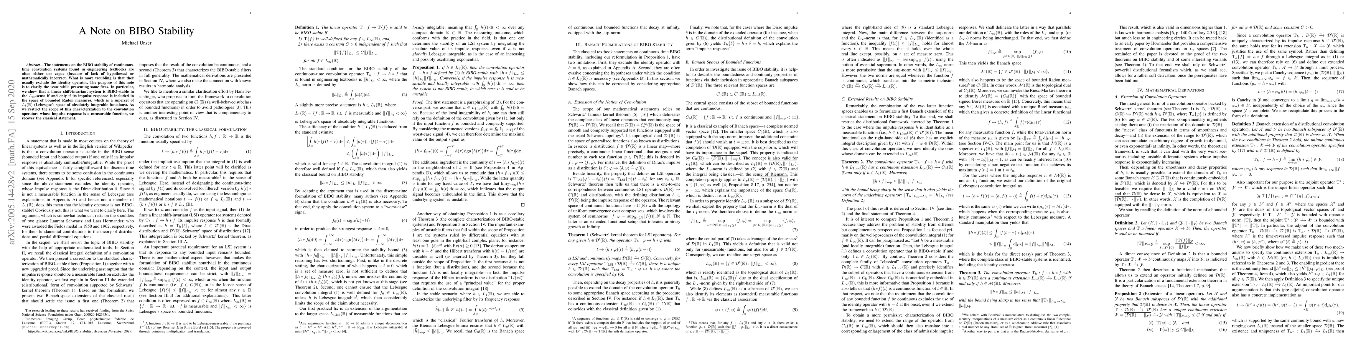 This paper clarifies misconceptions about BIBO stability in continuous-time convolution systems, correcting mathematical inaccuracies and excluding vague statements. It establishes that a linear shift-invariant system is BIBO-stable if its impulse response is a bounded Radon measure, extending the classical $L_1$ space.