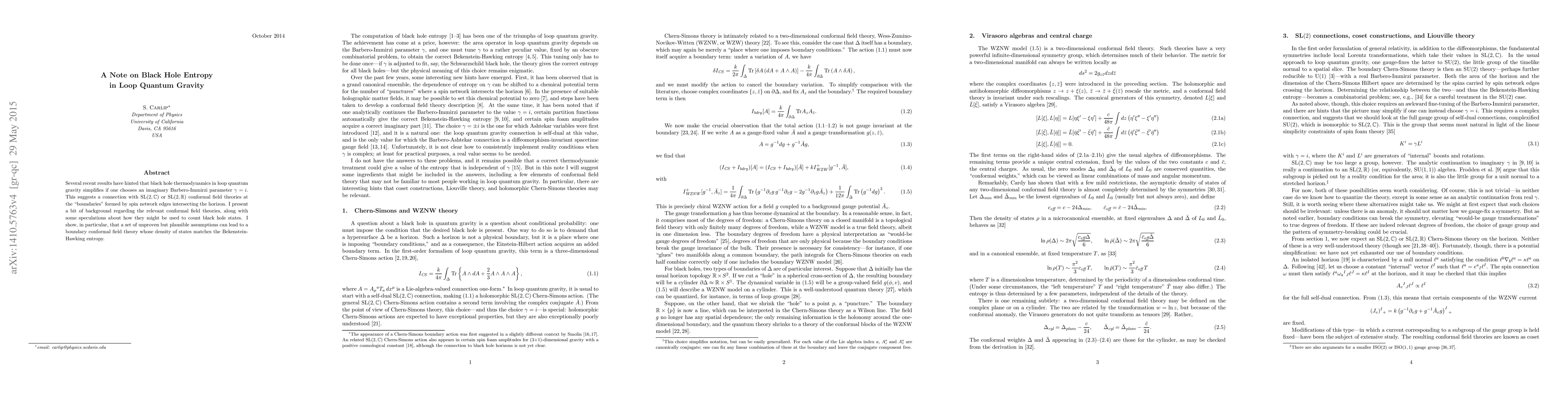 Several recent results have hinted that black hole thermodynamics in loop quantum gravity simplifies if one chooses an imaginary Barbero-Immirzi parameter $\gamma=i$. This suggests a connection with $\mathrm{SL}(2,\mathbb{C})$ or $\mathrm{SL}(2,\mathbb{R})$ conformal field theories at the "boundaries" formed by spin network edges intersecting the horizon. I present a bit of background regarding the relevant conformal field theories, along with some speculations about how they might be used to count black hole states. I show, in particular, that a set of unproven but plausible assumptions can lead to a boundary conformal field theory whose density of states matches the Bekenstein-Hawking entropy.