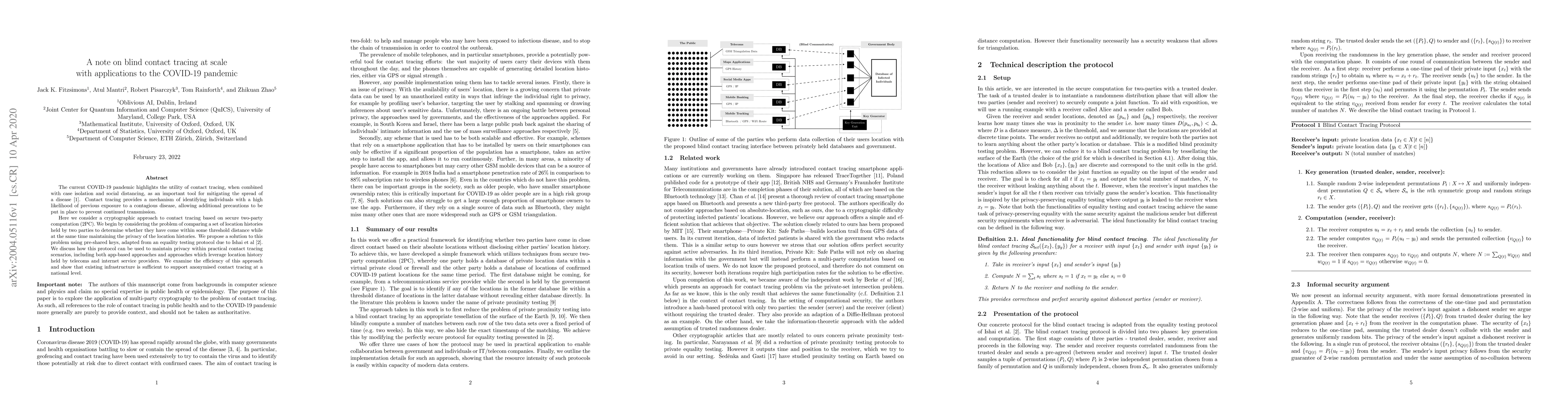 The current COVID-19 pandemic highlights the utility of contact tracing, when combined with case isolation and social distancing, as an important tool for mitigating the spread of a disease [1]. Contact tracing provides a mechanism of identifying individuals with a high likelihood of previous exposure to a contagious disease, allowing additional precautions to be put in place to prevent continued transmission. Here we consider a cryptographic approach to contact tracing based on secure two-party computation (2PC). We begin by considering the problem of comparing a set of location histories held by two parties to determine whether they have come within some threshold distance while at the same time maintaining the privacy of the location histories. We propose a solution to this problem using pre-shared keys, adapted from an equality testing protocol due to Ishai et al [2]. We discuss how this protocol can be used to maintain privacy within practical contact tracing scenarios, including both app-based approaches and approaches which leverage location history held by telecoms and internet service providers. We examine the efficiency of this approach and show that existing infrastructure is sufficient to support anonymised contact tracing at a national level.
