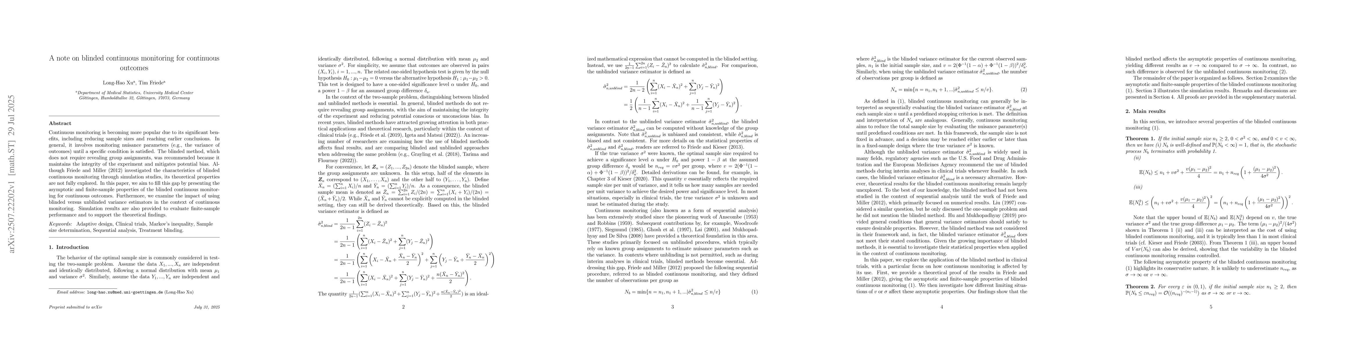 Continuous monitoring is becoming more popular due to its significant benefits, including reducing sample sizes and reaching earlier conclusions. In general, it involves monitoring nuisance parameters (e.g., the variance of outcomes) until a specific condition is satisfied. The blinded method, which does not require revealing group assignments, was recommended because it maintains the integrity of the experiment and mitigates potential bias. Although Friede and Miller (2012) investigated the characteristics of blinded continuous monitoring through simulation studies, its theoretical properties are not fully explored. In this paper, we aim to fill this gap by presenting the asymptotic and finite-sample properties of the blinded continuous monitoring for continuous outcomes. Furthermore, we examine the impact of using blinded versus unblinded variance estimators in the context of continuous monitoring. Simulation results are also provided to evaluate finite-sample performance and to support the theoretical findings.