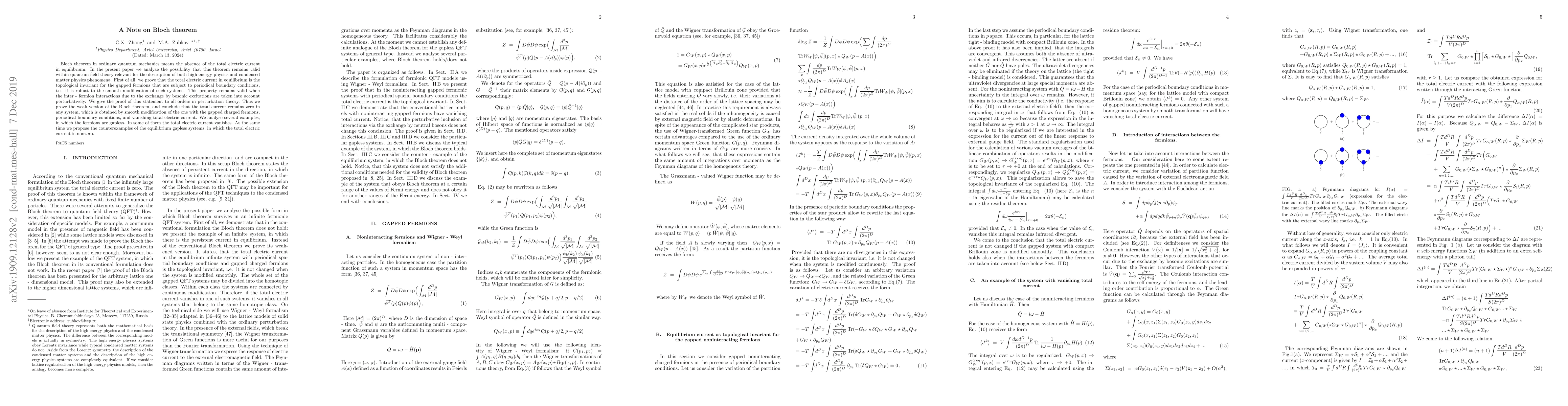 Bloch theorem in ordinary quantum mechanics means the absence of the total electric current in equilibrium. In the present paper we analyze the possibility that this theorem remains valid within quantum field theory relevant for the description of both high energy physics and condensed matter physics phenomena. First of all, we prove that the total electric current in equilibrium is the topological invariant for the gapped fermions that are subject to periodical boundary conditions, i.e. it is robust to the smooth modification of such systems. This property remains valid when the inter - fermion interactions due to the exchange by bosonic excitations are taken into account perturbatively. We give the proof of this statement to all orders in perturbation theory. Thus we prove the weak version of the Bloch theorem, and conclude that the total current remains zero in any system, which is obtained by smooth modification of the one with the gapped charged fermions, periodical boundary conditions, and vanishing total electric current. We analyse several examples, in which the fermions are gapless. In some of them the total electric current vanishes. At the same time we propose the counterexamples of the equilibrium gapless systems, in which the total electric current is nonzero.