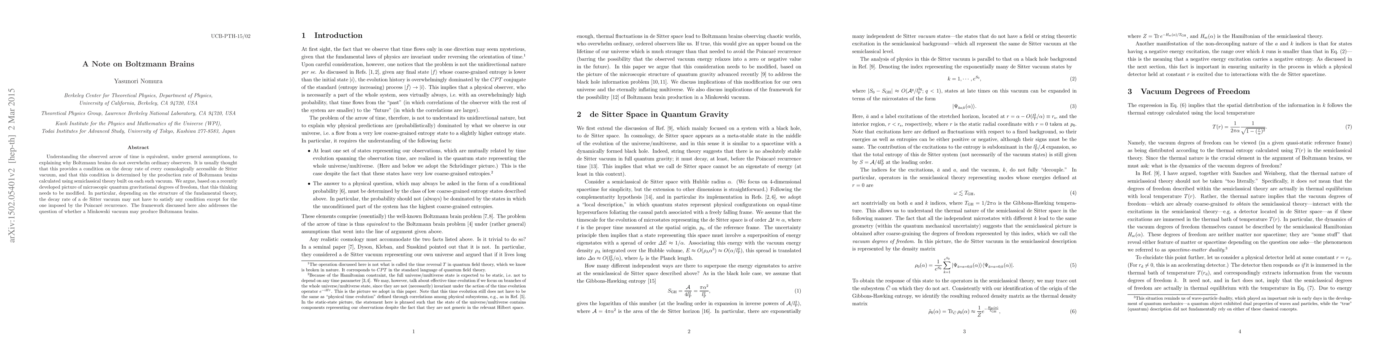 Understanding the observed arrow of time is equivalent, under general assumptions, to explaining why Boltzmann brains do not overwhelm ordinary observers. It is usually thought that this provides a condition on the decay rate of every cosmologically accessible de Sitter vacuum, and that this condition is determined by the production rate of Boltzmann brains calculated using semiclassical theory built on each such vacuum. We argue, based on a recently developed picture of microscopic quantum gravitational degrees of freedom, that this thinking needs to be modified. In particular, depending on the structure of the fundamental theory, the decay rate of a de Sitter vacuum may not have to satisfy any condition except for the one imposed by the Poincare recurrence. The framework discussed here also addresses the question of whether a Minkowski vacuum may produce Boltzmann brains.