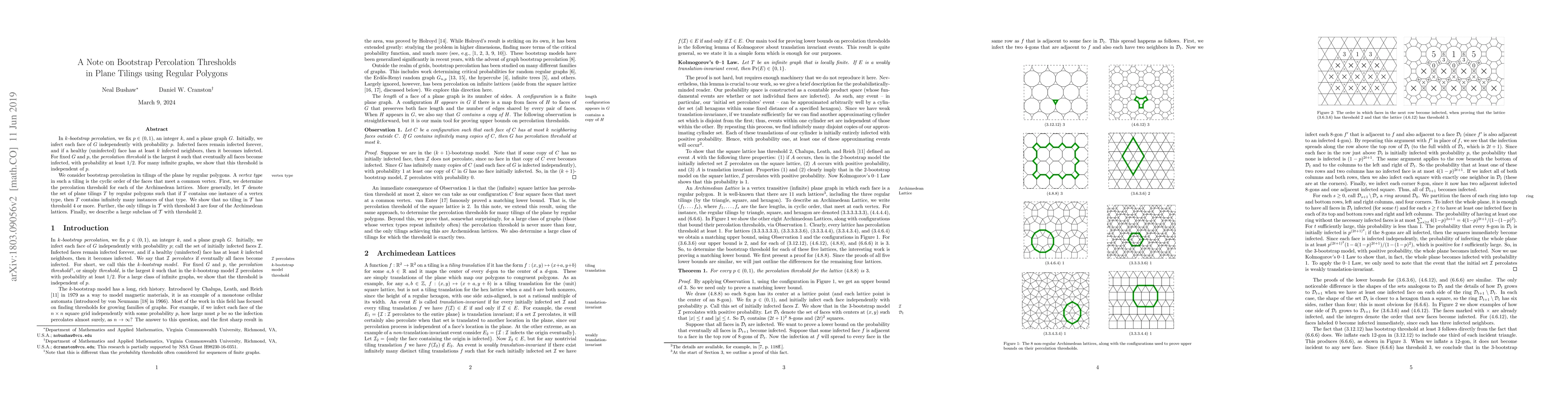 In \emph{$k$-bootstrap percolation}, we fix $p\in (0,1)$, an integer $k$, and a plane graph $G$. Initially, we infect each face of $G$ independently with probability $p$. Infected faces remain infected forever, and if a healthy (uninfected) face has at least $k$ infected neighbors, then it becomes infected. For fixed $G$ and $p$, the \emph{percolation threshold} is the largest $k$ such that eventually all faces become infected, with probability at least $1/2$. For a large class of infinite graphs, we show that this threshold is independent of $p$. We consider bootstrap percolation in tilings of the plane by regular polygons. A \emph{vertex type} in such a tiling is the cyclic order of the faces that meet a common vertex. First, we determine the percolation threshold for each of the Archimedean lattices. More generally, let $\mathcal{T}$ denote the set of plane tilings $T$ by regular polygons such that if $T$ contains one instance of a vertex type, then $T$ contains infinitely many instances of that type. We show that no tiling in $\mathcal{T}$ has threshold 4 or more. Further, the only tilings in $\mathcal{T}$ with threshold 3 are four of the Archimedean lattices. Finally, we describe a large subclass of $\mathcal{T}$ with threshold 2.