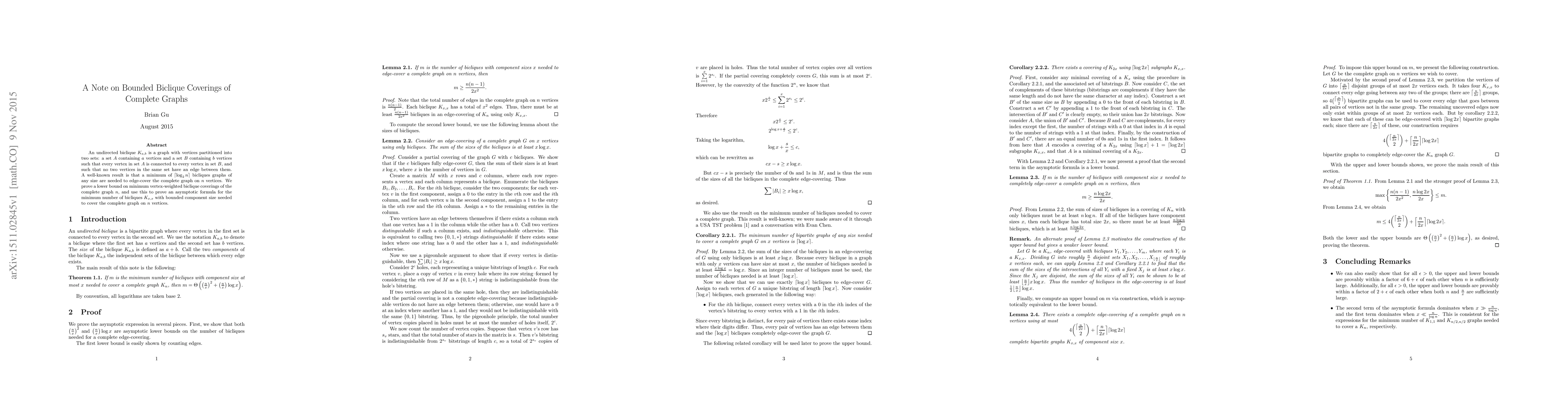 An undirected biclique $K_{a,b}$ is a graph with vertices partitioned into two sets: a set $A$ containing $a$ vertices and a set $B$ containing $b$ vertices such that every vertex in set $A$ is connected to every vertex in set $B$, and such that no two vertices in the same set have an edge between them. A well-known result is that a minimum of $\lceil \log_2{n} \rceil$ bicliques graphs of any size are needed to edge-cover the complete graph on $n$ vertices. We prove a lower bound on minimum vertex-weighted biclique coverings of the complete graph $n$, and use this to prove an asymptotic formula for the minimum number of bicliques $K_{x,x}$ with bounded component size needed to cover the complete graph on $n$ vertices.