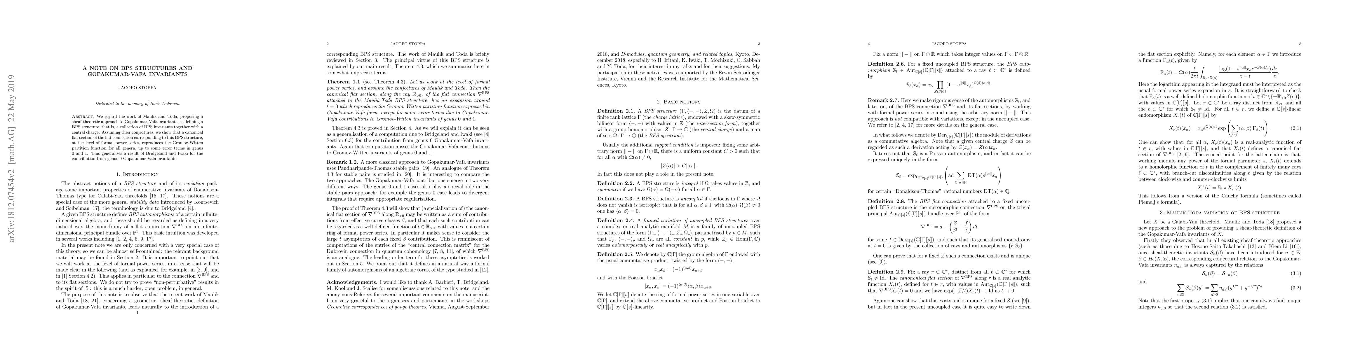 We regard the work of Maulik and Toda, proposing a sheaf-theoretic approach to Gopakumar-Vafa invariants, as defining a BPS structure, that is, a collection of BPS invariants together with a central charge. Assuming their conjectures, we show that a canonical flat section of the flat connection corresponding to this BPS structure, at the level of formal power series, reproduces the Gromov-Witten partition function for all genera, up to some error terms in genus 0 and 1. This generalises a result of Bridgeland and Iwaki for the contribution from genus 0 Gopakumar-Vafa invariants.