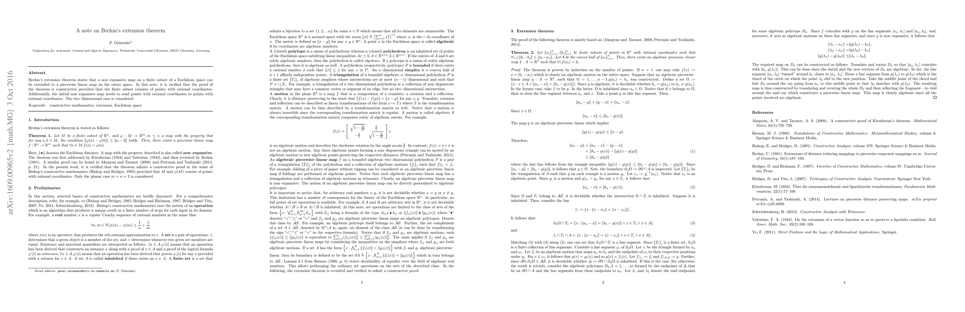 Brehm's extension theorem states that a non-expansive map on a finite subset of a Euclidean space can be extended to a piecewise-linear map on the entire space. In this note, it is verified that the proof of the theorem is constructive provided that the finite subset consists of points with rational coordinates. Additionally, the initial non-expansive map needs to send points with rational coordinates to points with rational coordinates. The two-dimensional case is considered.