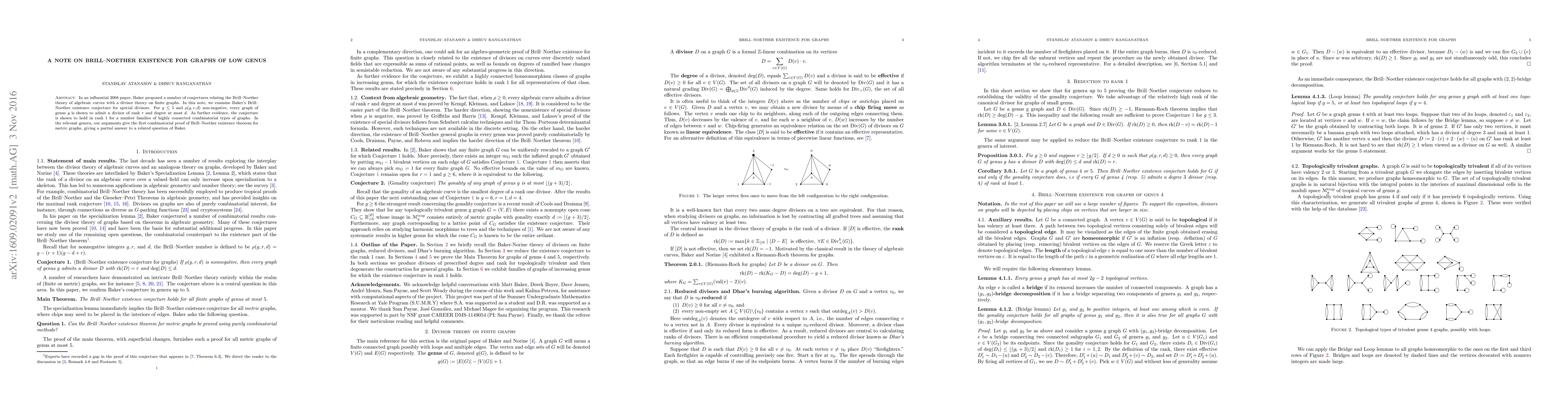 In an influential 2008 paper, Baker proposed a number of conjectures relating the divisor theory of algebraic curves with an analogous combinatorial theory on finite graphs. In this note, we examine Baker's Brill--Noether existence conjecture for special divisors. For $g\leq 5$ and $\rho(g,r,d)$ non-negative, every graph of genus $g$ is shown to admit a divisor of rank $r$ and degree at most $d$. Moreover, the conjecture is shown to hold in rank $1$ for a number of families of highly connected combinatorial types of graphs of arbitrarily high genus. In the relevant genera, our arguments give the first combinatorial proof of the Brill--Noether existence theorem for metric graphs, giving a partial answer to a related question of Baker.